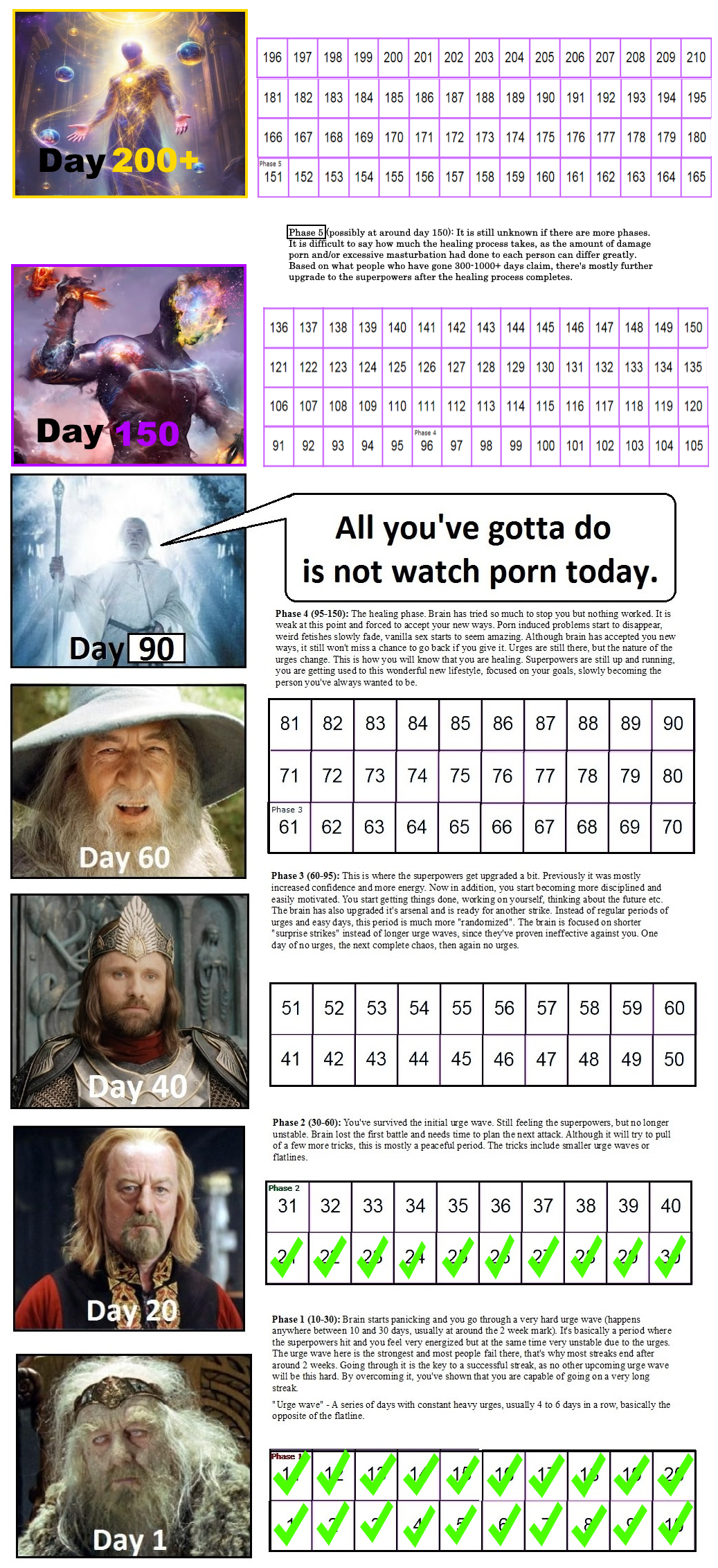 >In case of urges:- https://imgur.com/a/nofap-anecdotal-evidence-g4eGH- Don't peek and Hold your breath for as long as you possibly can. The urge usually pass after that. If not, repeat.- Horse stance or chair pose: Do it while clenching the abdomen and all legs' muscles, raise arms for extra blood flow redirection. Works both for killing erections or urges.- Any physical activity.- Testicular breathing (also works for wet dreams). Take a deep breath while flexing your perineal muscles. Hold for a couple seconds then release, as you let the sexual energy/tension levitate through your spine to your brain. Repeat around 7-9 times. You can do this in any position.On long clean streaks many report benefits that transcend current science like a sort of "magnetism" or higher "vibration/aura" that attracts/appeals to other living beings, a higher perception, a stronger and intimidating "aura/presence", a deeper connection with nature, an attractive BO (people usually report it as "pheromones") and more.>Advices:- Mental Purity 1.1: Semen Retention acts as a bio-electromagnetic amplifier. Watch the quality of your thoughts because your inner state will get amplified and manifested. Lust is the Ojas killer. Do not engage with Lust.- Mental Purity 1.2: Keep a journal as a tool for introspection.- NEVER watch porn of any kind.- Remove triggers from your life. Masturbation is a bad habit. Break that bad habit.- Focus on achieving a goal. An art, a craft, competing, etc.- Meditate and/or Pray Daily. Try a minimum of 5 minutes to start off.- Exercise/Gym/Sports/Martial Arts. If it is something social even better.- Good habits like healthy eating, water fasting, dry fasting, sun exposure and cold showers do seem to speed up the process.- Sublimation: literally using the energy.- Transmutation: changing the quality of energy to something different. (Surya Namaskara, 8 brocades, Tibetan rites)- Avoid stimulant drugs such as caffeine or adderall