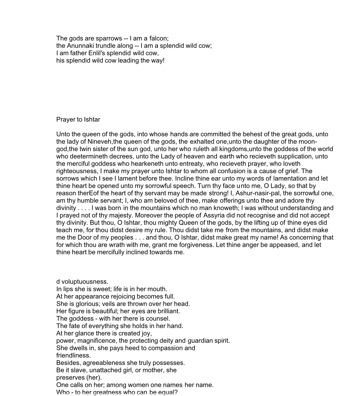 >>42119264>>42119266>>42121025Supplicant: Speak, O passionate one, that I may know your caress!The Goddess: I am the unbridled woman;I am the cry of passion in the inner chamber And the caress that stirs aching loins.I am the sacred whoreWho causes virtuous men to tremble with lust; I am the dancing girl whose hips part the waves of the sea.I am the cool wave that pulls you under;I am the heat of the midday sun that burns you with my kiss;I am the deepest cave whose depths you long to explore.Supplicant: Speak, O passionate one, that I may know your caress!The Goddess: The chaste maiden and youth cannot escape my sight; My eyes unlatch locked doors.The chaste maiden and youth cannot cloister themselves in the holy chamber;My feet lead me to them and I draw them out with my dance.The chaste maiden and youth cannot seal themselves away in a bower;My hands caress them and stir their longing for one anotherAnd bring them close so that they may consummate their love.Supplicant: O holy whore of Babylon,O liberated one,O passionate lover without rival!Inanna, you are worthy to be praised; Great is your name in Heaven, Earth, and the Underworld!