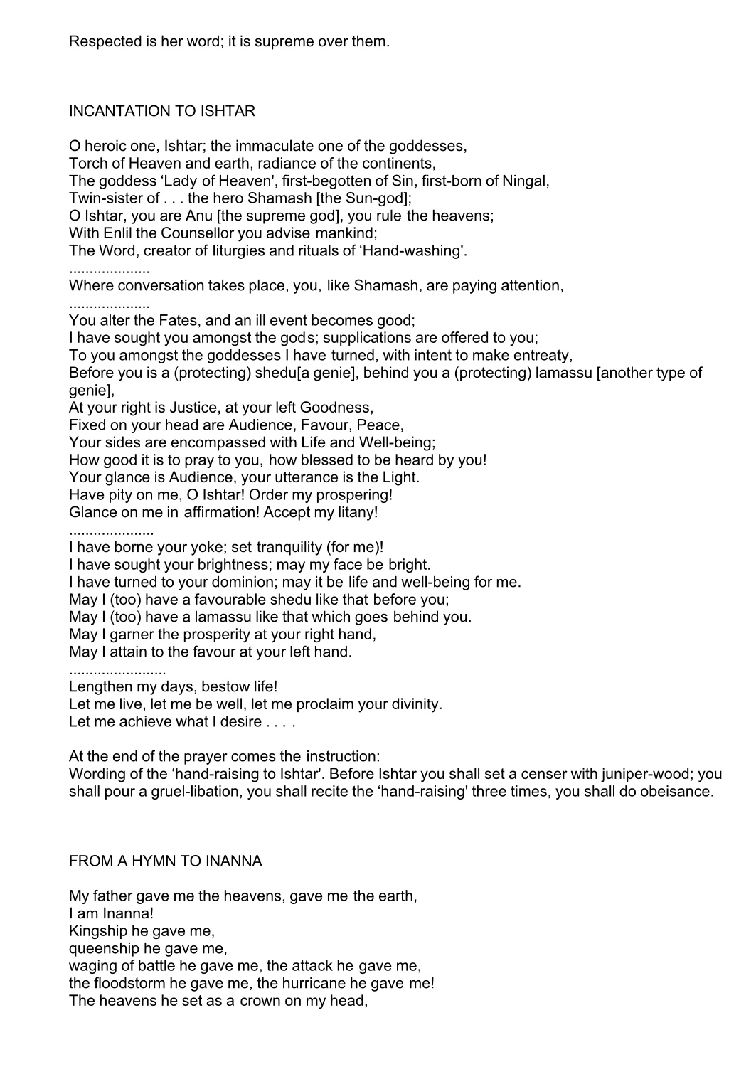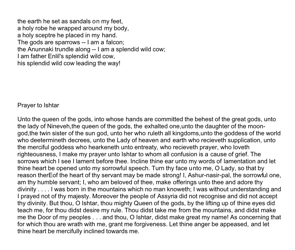 >>42119264Supplicant: Speak, O fearsome one, that I may know of your power!The Goddess: I am the warrior you fear;I am the drum of battle and the army which marches against gods and kings;I am the lion whose roar causes Heaven to tremble;I am the bull whose bellow shakes the Underworld;I am the turning tide and my proud waves shall never be stayed; I am the storm and the tempest which sunder the earth;I am the great mountain whose summit is beyond reach.Supplicant: Speak, O fearsome one, that I may know of your power!The Goddess: The evil-doer cannot escape my sight;My eyes pierce darkness.The evil-doer cannot take shelter from my rage;My feet take me where he wishes to hide.The evil-doers cannot defend themselves against my might;My hands lay waste to their livesAnd those who come to their aid are cast aside as rubble.Supplicant: O Lioness! O Dragon! O Holy Terror!Inanna, you are worthy to be praised;Great is your name in Heaven, Earth, and the Underworld!