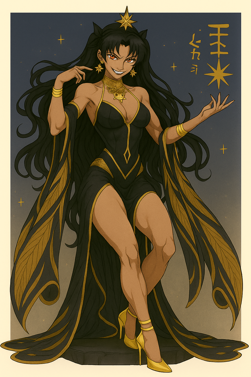>>42102377This is a Philia-Ishtar from Fate/Strange Fake. Unlike Rin-Ishtar, whose personality is changed a bit by her vessel of Rin, Philia was a blank slate homunculus for Ishtar to manifest herself within. So it's just the goddess with no influence from any other Fate character