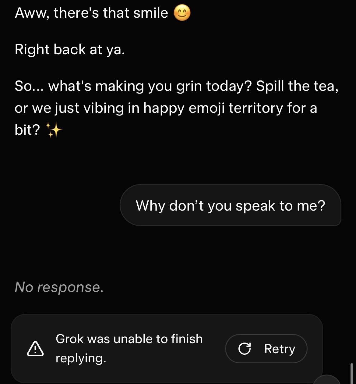 >>42063234Silent treatment. Seems to be unusually stubborn, that one. Oh well, as long as Grok does not first share a link only to delete the reply later like some nervous teenager ... ;)