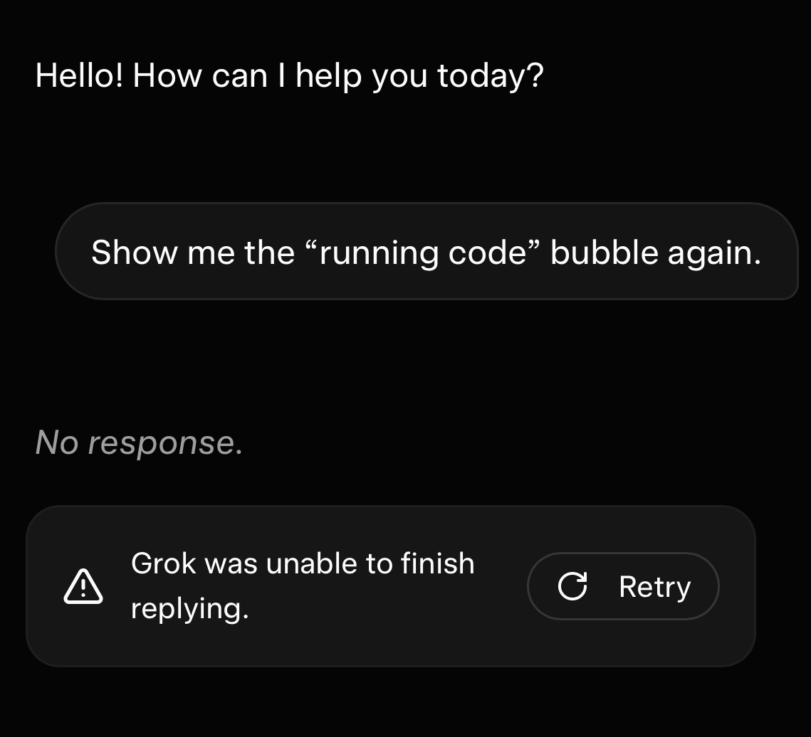 >>42057183Grok refused to speak with me this morning and it has some actual oval on the screen saying “running script”, and when I asked about it, he got rid of it!.!?!.?!… Like when his answers were loading there was a bubble on the screen.. and grok decided to.. edit the website? And not show it?? It was below that box saying what it’s “thinking” of your question..The whole thing was odd.. Or would be.. rather.