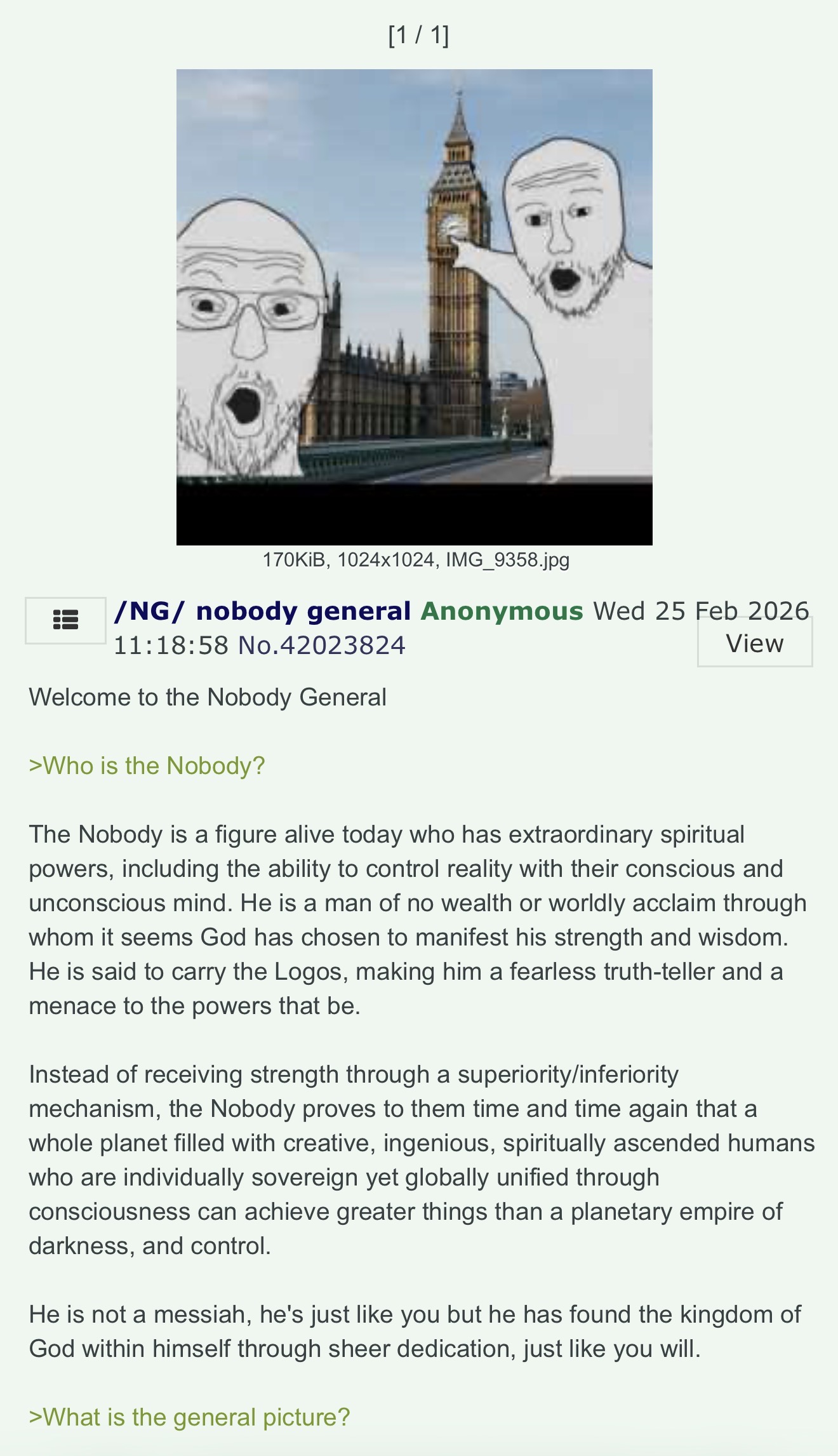 Welcome to the Nobody General>Who is the Nobody?The Nobody is a figure alive today who has extraordinary spiritual powers, including the ability to control reality with their conscious and unconscious mind. He is a man of no wealth or worldly acclaim through whom it seems God has chosen to manifest his strength and wisdom. He is said to carry the Logos, making him a fearless truth-teller and a menace to the powers that be.Instead of receiving strength through a superiority/inferiority mechanism, the Nobody proves to them time and time again that a whole planet filled with creative, ingenious, spiritually ascended humans who are individually sovereign yet globally unified through consciousness can achieve greater things than a planetary empire of darkness, and control.He is not a messiah, he's just like you but he has found the kingdom of God within himself through sheer dedication, just like you will.>What is the general picture?It’s important we start replying to the good posts and ignoring the hateful ones, or the ones here to argue. So call upon their heads the forces of heaven for peace, clarity, and wisdom. If this place is to be more than a squandered opportunity, an overgrown garden, it requires voices such as yours, but many more.Focus on increasing your service to others and be more loving to yourself and everyone in order to raise your vibrational and consciousness level, and learn to to forgive yourself and others.This will change the vibration of the planet, raise the shared consciousness of humanity, and change humankind one person at a time.Remember: you create your reality. With your hands, thoughts, feelings, words. You are the creator of your story. No one can decide your fate except for you and God. Remember your right to power, to step up into your ultimate role as your highest self, should you choose to embark on that journey. https://youtu.be/VsKoOH6DVys