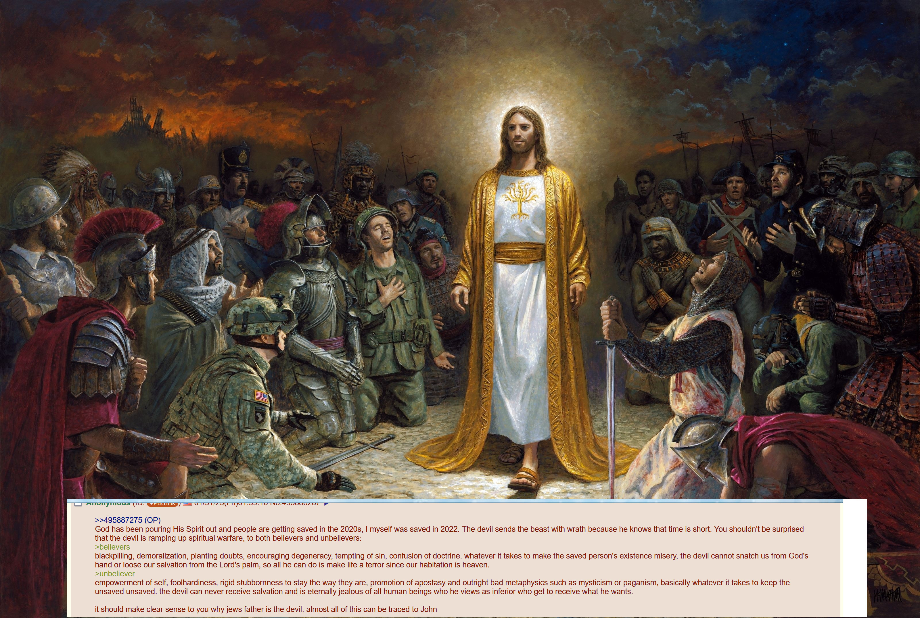 >>42136183I was stuck in it for a long time. Even after escaping it for a while I noticed how much of my and everyones language and thought patterns are controlled by the psyop. Imagine and ponder the things that must have gone on when the retards were spreading it throughout Europe. Burning women alive for having beautiful hair, killing men in front of their families for not converting. Christ is the Enemy of you who read this. It is insidious.Also hilarious their own book says people will flock to false religions in the end, and look how they all flock to the false churches for their false ending. Remeber everyone before world war 1 and 2 were both “absolutely certain” it was the time of revelations. Also notice how the theorists are jumping us all around the Bible timeline, this is confusion, not of God. They tell the soldiers going to Iran now that Trump is chosen by Jesus to bring on the end times. This is an obvious lie meant to make them say “fuck it, everyone is dying, might as well go die in this war”Christianity is a control matrix, it’s sad to see others fall to it, on both sides, Satanism is just as evil in its own ways.The idea of a singular “overgod” predated Christ and was becoming very popular in Europe, especially Rome, as the popularity of their old cults died out. Christ did not bring this message to the world, and trusting the den of vipers that is his people is a foolish and dangerous thing. I will pray for you. The devil does not lie, he just twists the truth. You worship the god of those who are like their father the devil. This thread is fucking WILD proof of that, just read some of this shit, absolutely Satanic christians on display, so sure of themselves like the vaxxies were.
