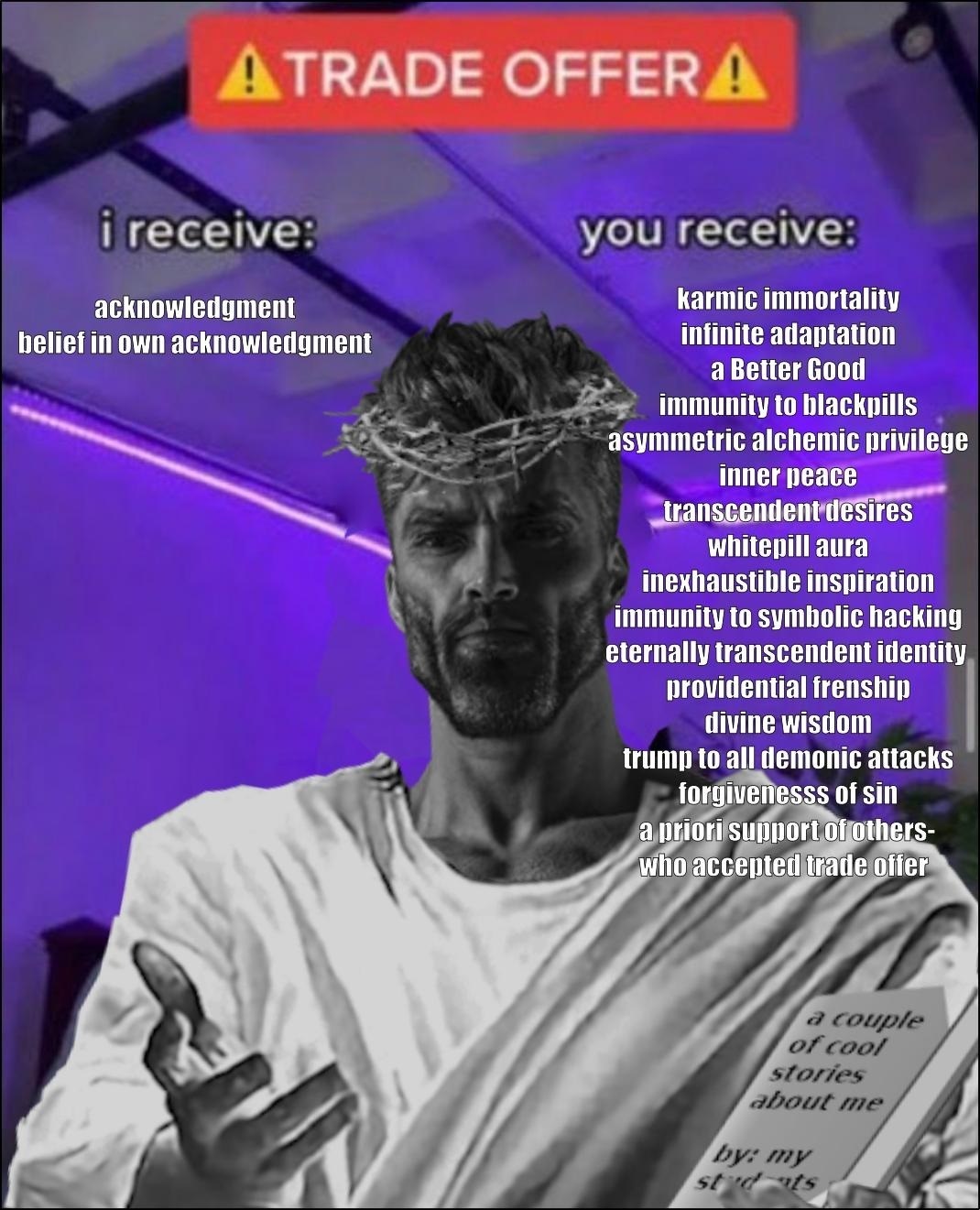 >>42126189I follow the example of jesus (not a "christian" not a "gnostic" either). I am married to Wisdom, the divine Feminine Herself.There is no problem. Evil is the byproduct of free will, which is required for good to manifest period. In exactly the same way you do not get refined metal without dross, you do not get a refined soul of goodness, without the tempation to evil. Those that succumb to it, are dross and will be destroyed utterly. Those that don't, are refined. (Those that are destroyed, are not annihilated, their essence returns to the father and are repurposed this is where the idea of Reincarnation-as-failure-condition arises from).