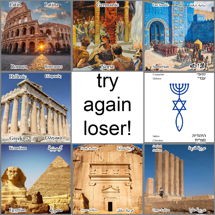> West Semitic Canaanites (Ugarit, Phoenicia) [+ Arabic (Sheba, Qedarites)]: Eretz [Erid] (lit. Earth), Tehom (lit. The Deeps) [Falak (lit. Galaxy)], Sheol (lit. Hell) | Mot [Manat] (lit. Death), Yam (lit. Sea) | Lotan (rules the Sea) [Abgal (comes from the Sea)], Shamayim (lit. Sky)| Elyon (lit. High) [Elyon (lit. High) | Dhu Samawi (lit. Lord of the Sky)], and beyond him you know the rest.