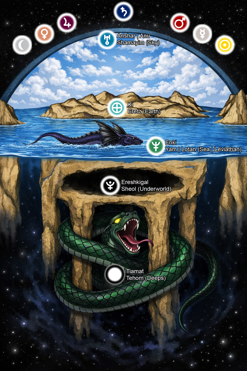 > East Semitic (Akkadian, Babylonian, Assyrian): Ki (literally means Earth), Tiamat (lit. The Deeps), Ereshkigal (rules in the Underworld), Enki (rules the Sea), Anshar (lit. Sky) and beyond him are the Big 7 Stars (who were considered the gods): Moon, Mercury, Venus, Sun, Mars, Jupiter and Saturn.