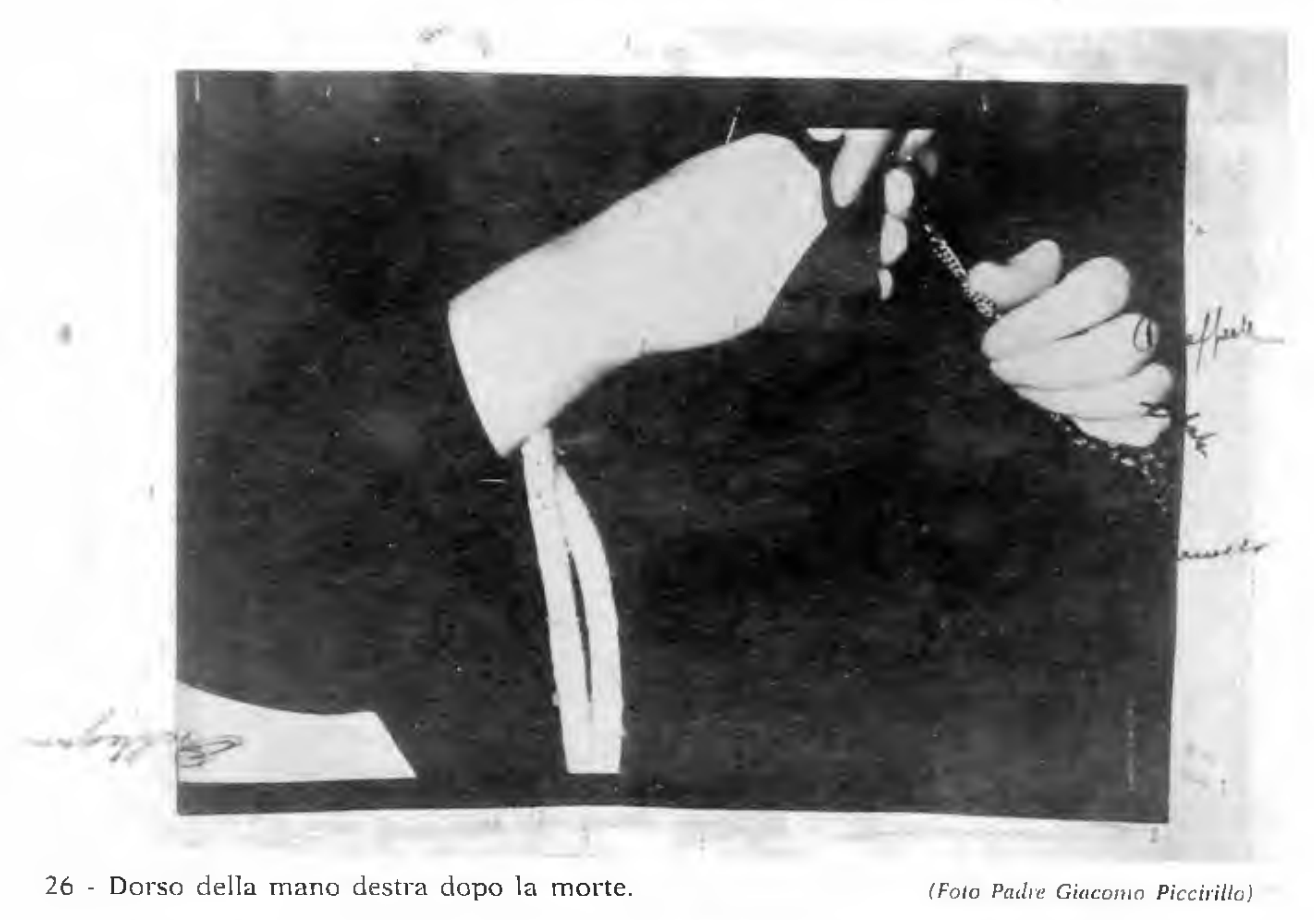 (Resolution) In the final years of St. Pio’s life, his lesions gradually disappeared. By September 22nd, 1968—the date of his last Mass—only the lesion on his left palm remained. On September 23rd, 1968, St. Pio passed away. Within minutes of his death, his hands, feet, and chest were examined and photographed. “The skin, in those points referred to, was the same as that of any other part of the body, soft, elastic, and mobile…. The appearance, color, and consistency did not reveal anything in particular, nor did they reveal the presence of signs of previous incisions, lacerations, wounds, sores, or inflammatory reactions.”