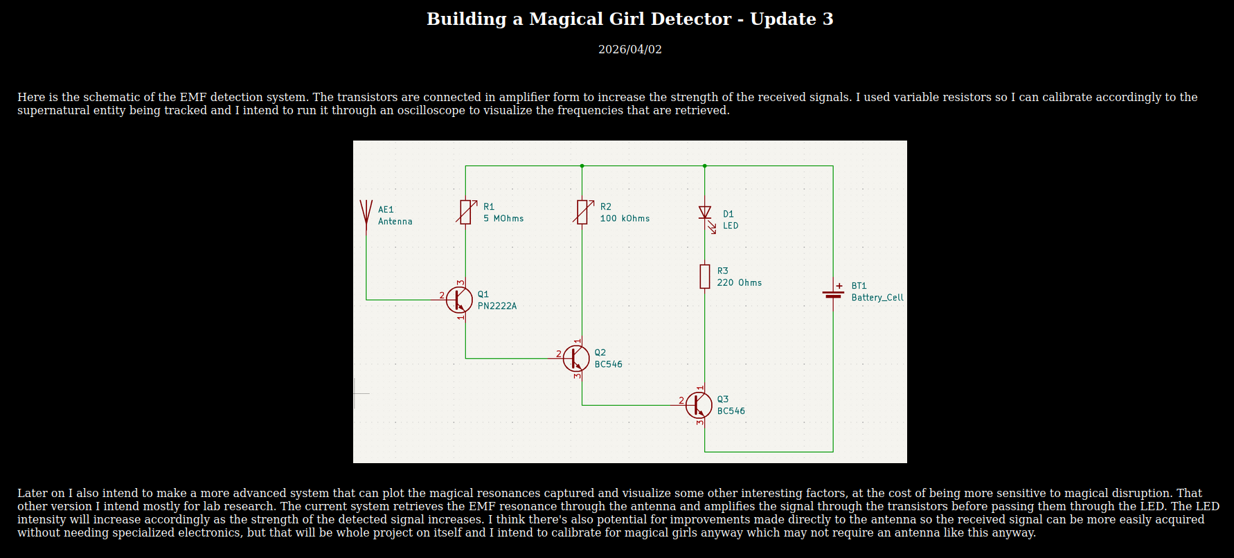 Archive anon here, here is the schematic of the circuit as an amplifier to capture and increase the strength of EMF signals. What type of material do you think would react more strongly to a magical girl's presence?USK@N4exSBIiho5xplSzgLi6qbPOkcYMfvOYvr9r0x9NeBU,~qDAEjglIskG8Ohx6rIs94OPZwZwrC5ACrsYwbRg7uI,AQACAAE/nullnexus/7