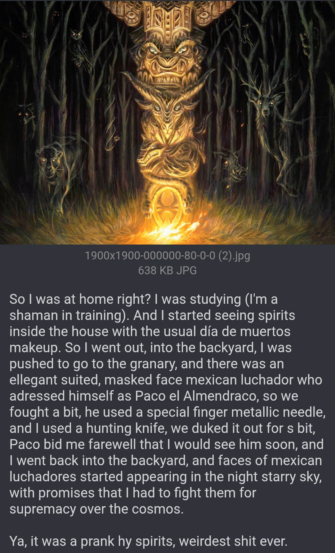 >>42228680Notice, that sometimes the spirits mess with you, tho (one day I might tell you about Paco el Almendraco, maximum space opera style visions about cosmic mexican wrestlers).