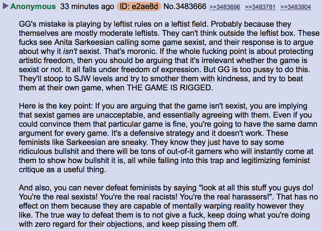 >>42174122>Gamergate lost. We live in the worst possible timeline.Anti-GG may have won, but it was a Pyhrric victory. GG exposed terminally online young white men to the cabal of progressive leftists trying to marginalize and destroy them. This led to a major shift in online discourse which eventually led to Donald Trump's first election in 2016. I don necessarily mean that Trump was literally memed into office, but an outsider movement against Critical Theory started to form, and the woke/anti-woke dichotomy that dominates all modern social politics was created.If they'd left the fucking videogames alone, the Long March through the Institutions would have continued unimpeded.