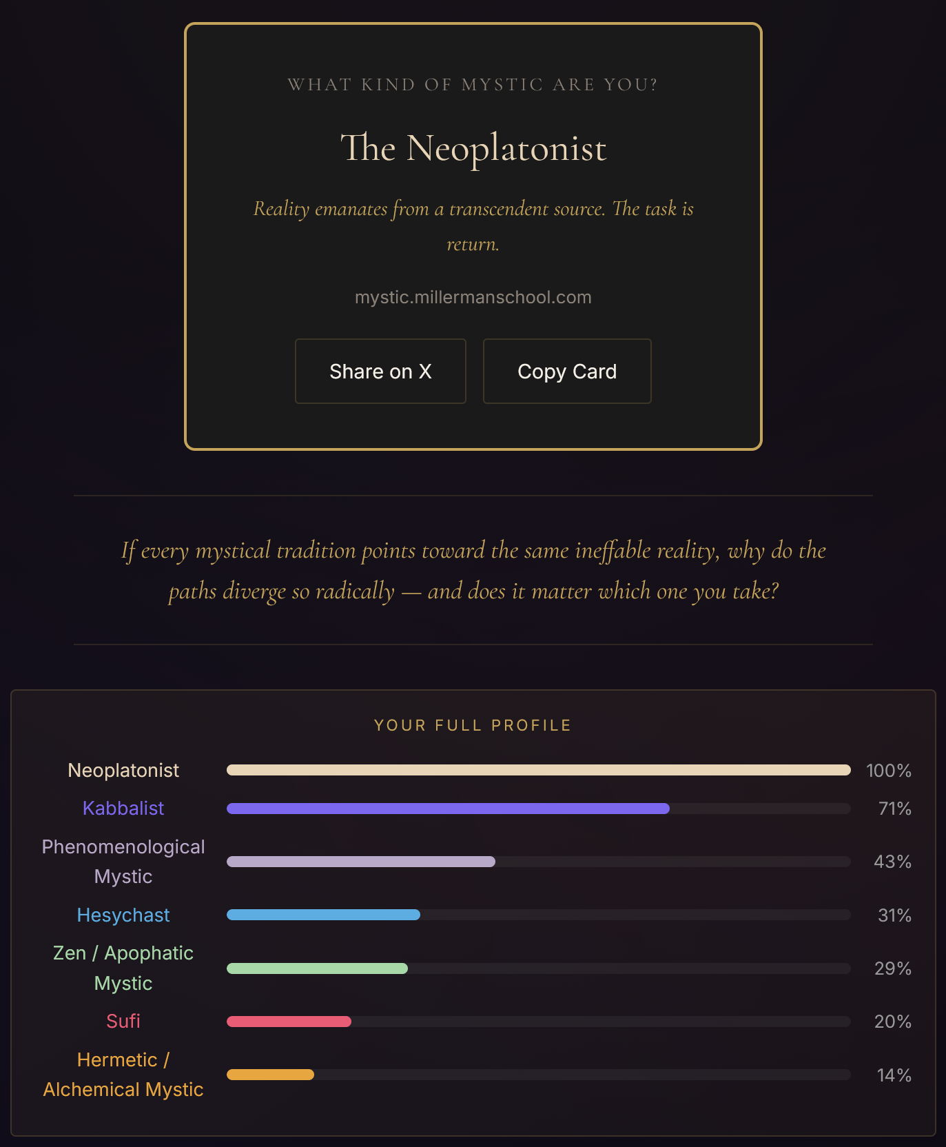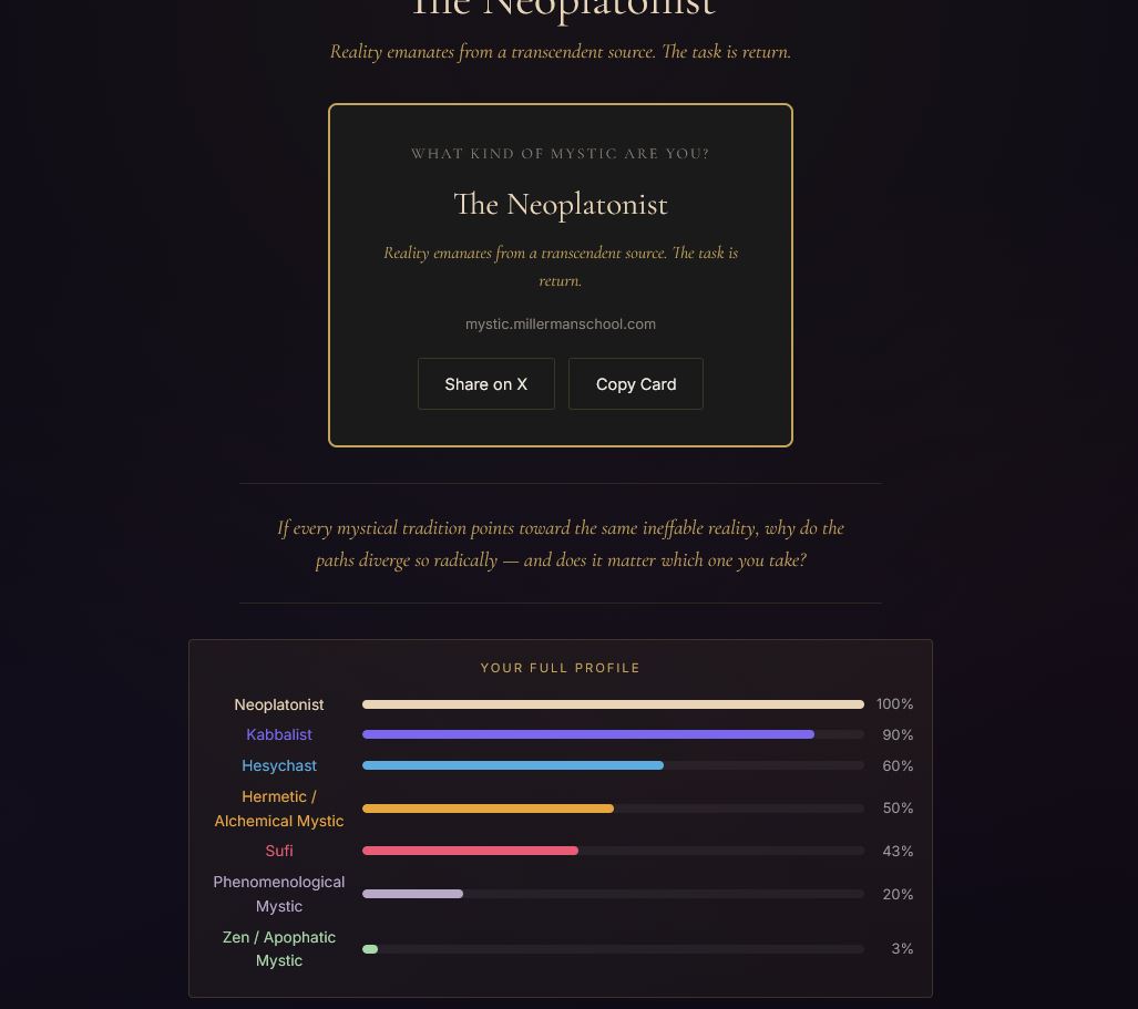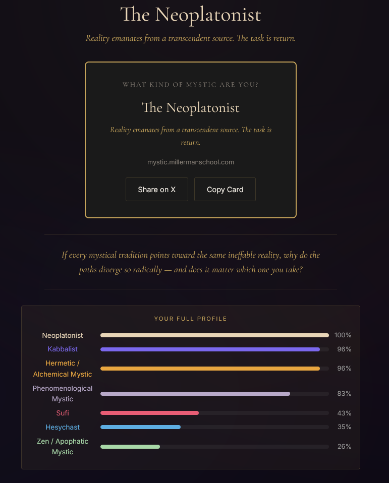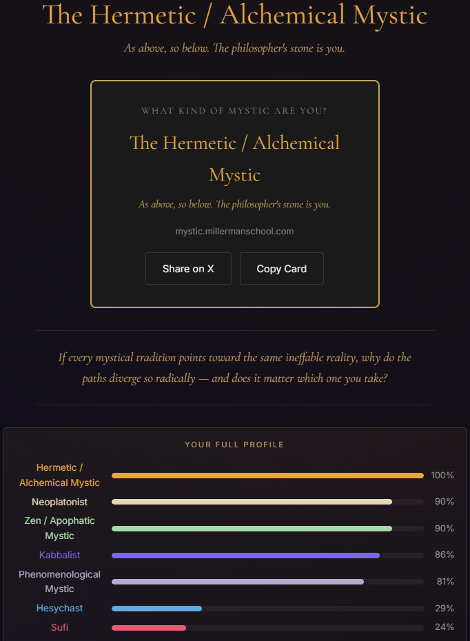 new /x/ tier quiz just dropped.according to this i should become a sufi mystichttps://mystic.millermanschool.comtake the quiz and report back with what you get too