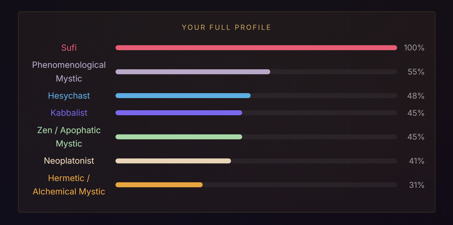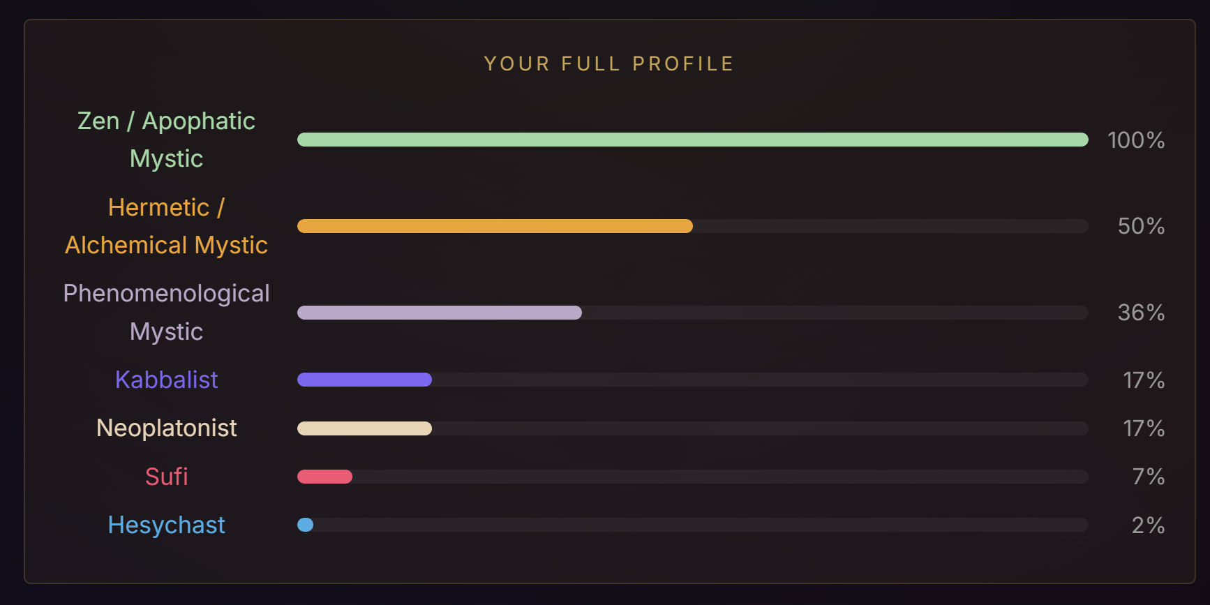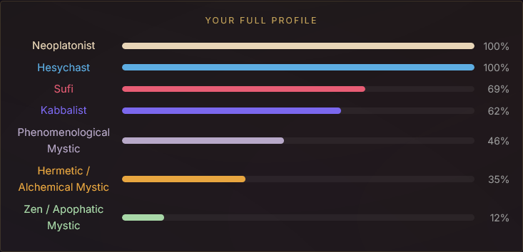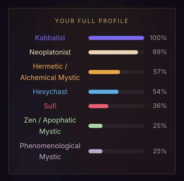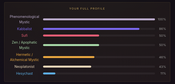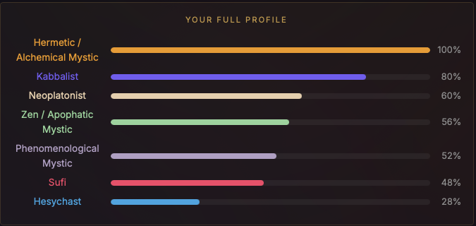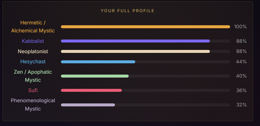 >>42175125I took this test a couple times when I was in different states of mind. I've taken it about five times now, and each time I made sure to consider the questions with a fresh perspective, and answer honestly, even if I still feel like answering the same way.The aggregate of all my tests points to Hermetic/Alchemical Mystic, so overall I guess that's me. Second highest was Sufi mystic. I guess the idea of transformation is really important to me, but also, love, because I think love is what transforms you. So kind of a blend of hermeticism and sufism I suppose?