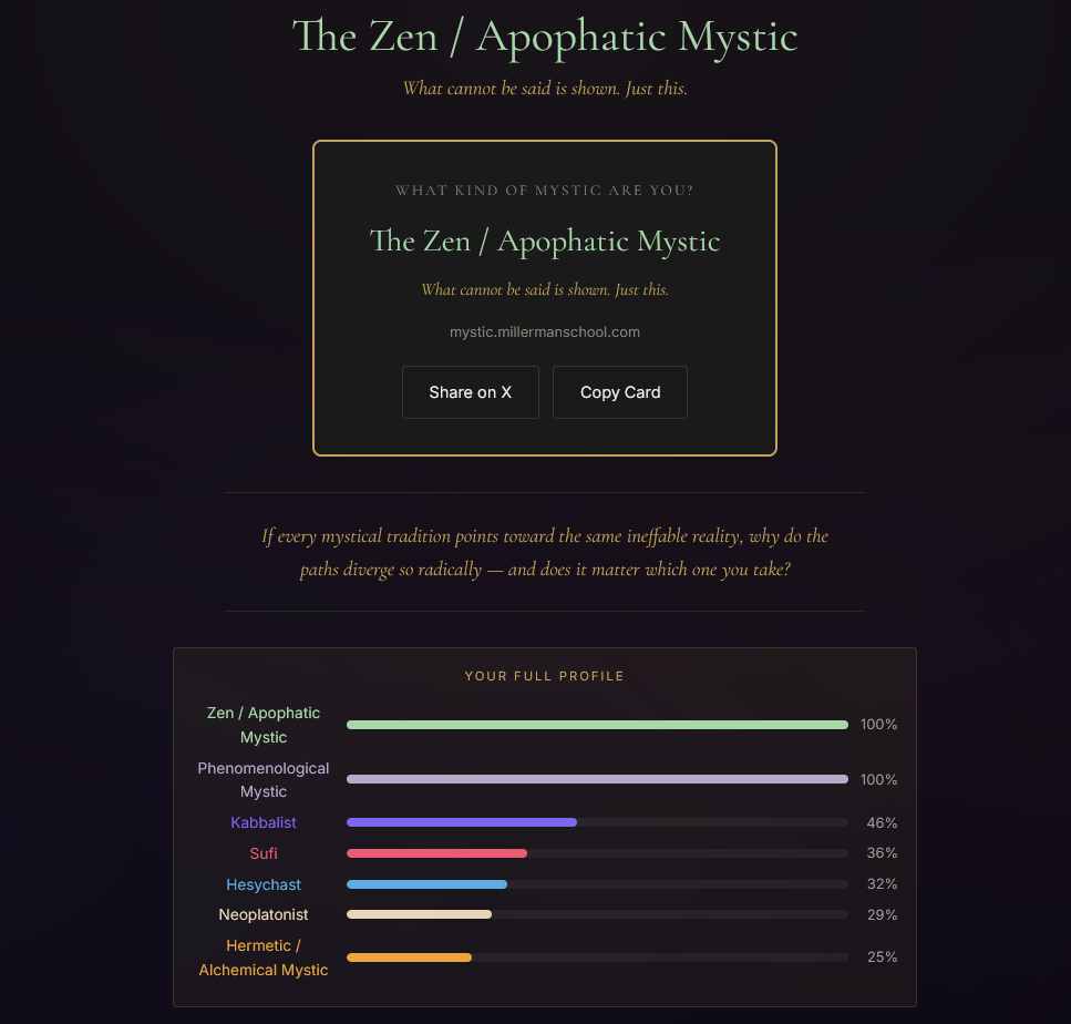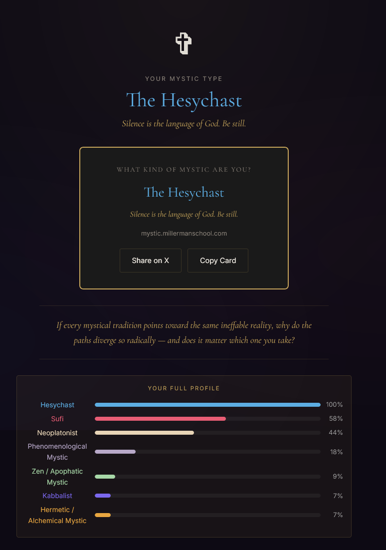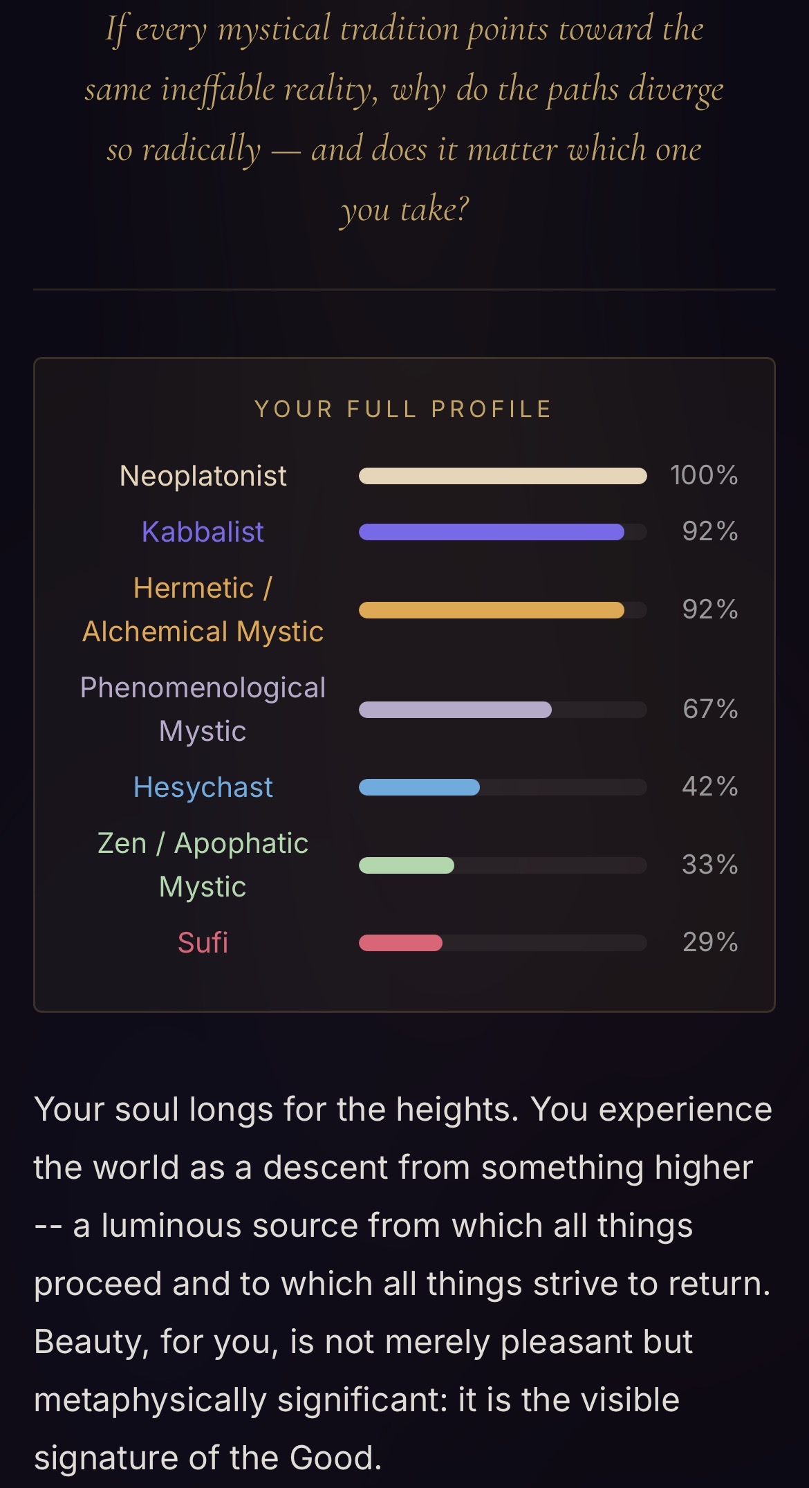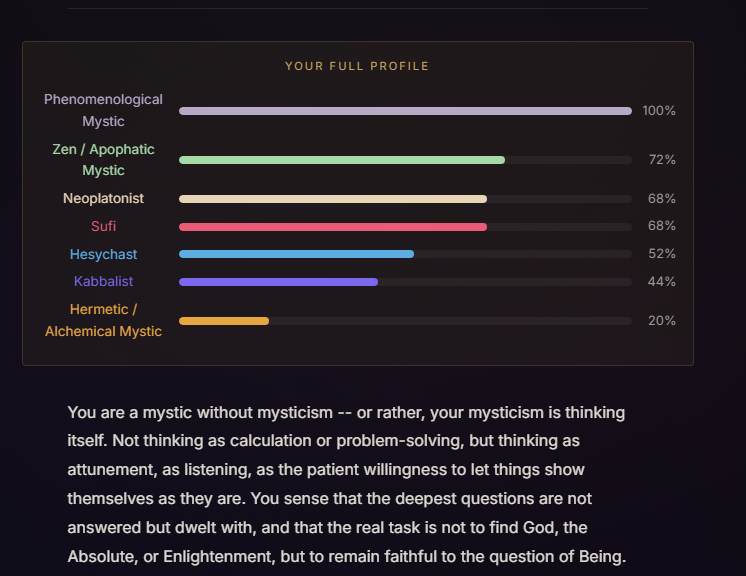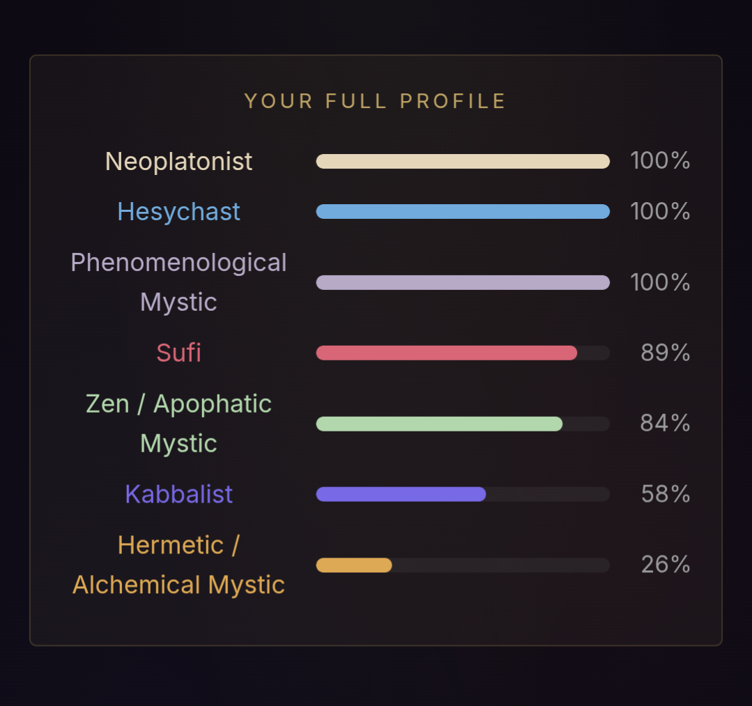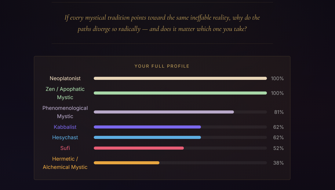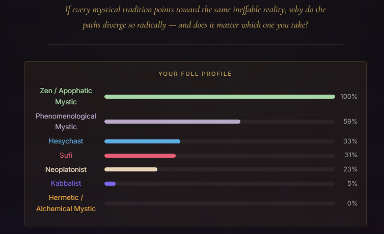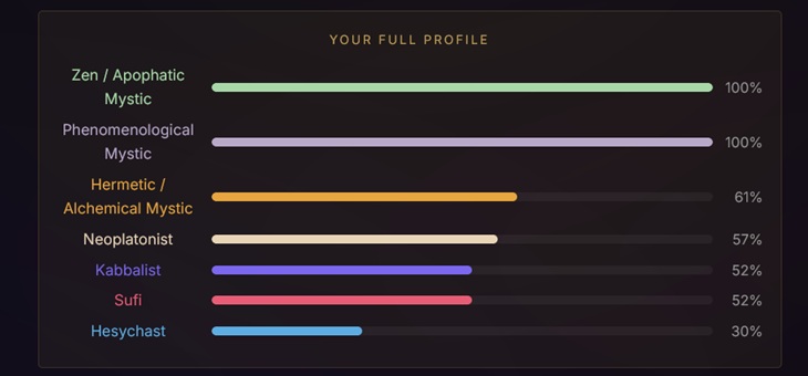 Very interesting quiz, and the answer choices are beautiful, but I must not be ready for it. >What does sitting in silence bring you?Probably depression and worries>You encounter something you can't explain. Your instinct is to…Freak out and hope there's a rational explanationI took it three times, changing my answers to the questions where I liked multiple answers, and got three different results. The Phenomenological Mystic result shills the company that made the quiz and seems to be trying to assert they're real mystics, which makes me question it. If nothing else, the quiz helped me clarify what I currently believe. I don't think the divine is in all things or that the divine is actually the hidden order that the material world stems from or anything like that. I think the divine is something that we can connect to by doing or experiencing specific real-world things, like love and appreciating beauty, but it isn't everything. Hope there's a path like that.