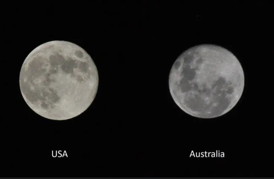 >>42177626On a spherical Earth, the direction “up” changes with latitude. An observer in the north tilts their head “up” toward the north celestial pole; an observer in the south tilts “up” toward the south celestial pole. Because the Moon is relatively close (compared to stars), this difference in orientation causes the familiar “upside‑down” effect – the same lunar features appear rotated.