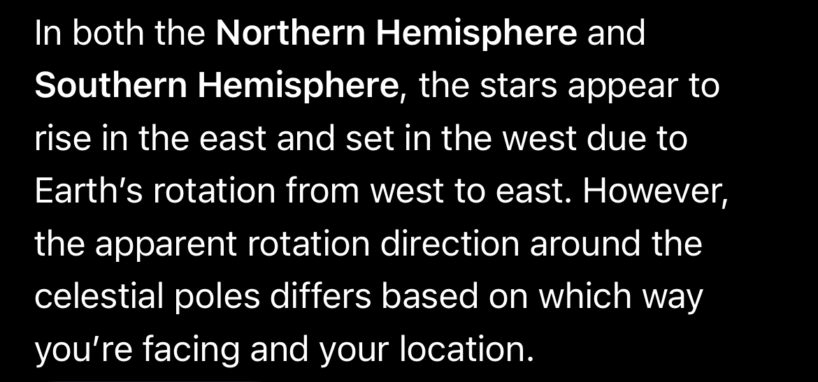 >>42177640In both the Northern Hemisphere and Southern Hemisphere, the stars appear to rise in the east and set in the west due to Earth’s rotation from west to east. However, the apparent rotation direction around the celestial poles differs based on which way you’re facing and your location. Debunked.