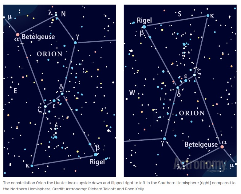 the constellations are also upside down and reversed in the southern hemisphere.if you turn your head upside-down it looks normal as seen in the northern hemisphere.pretty freaky desu.