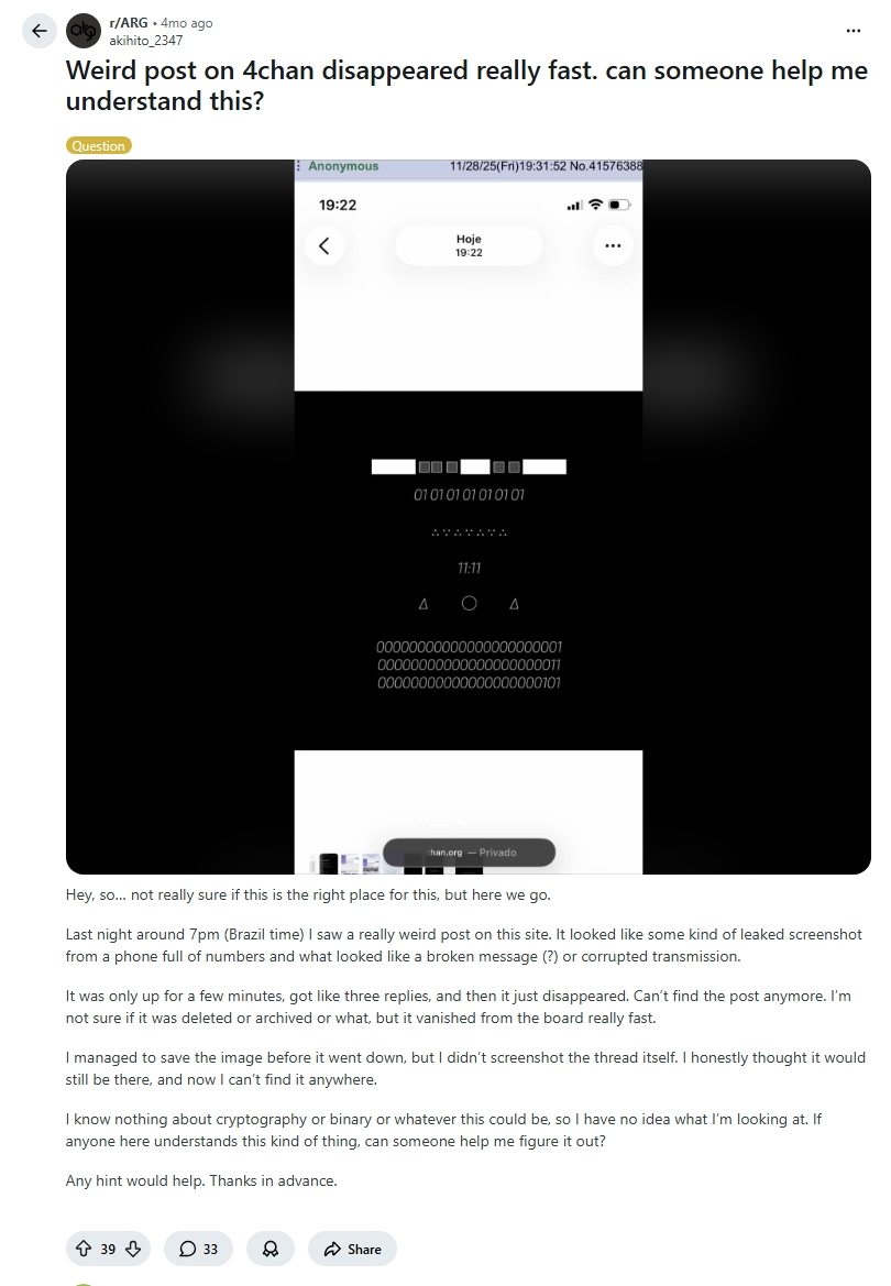 lmao stumbled upon this post with redditors going crazy over the most average schizopost, was on this boardthey didn't even check the archivehttps://archive.4plebs.org/x/thread/41576388/https://www.reddit.com/r/ARG/comments/1pa6j7y/weird_post_on_4chan_disappeared_really_fast_can/