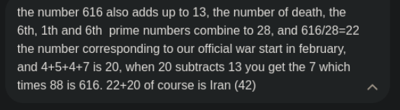 >>42186903No retard its as such:Chesed in hebrewequals 72, in simple gematria 72 = covid-19Chesed is the Pillar of Mercy and in this sense such because people chose the jab out of "duty" to societywhile Gevurah is on the pillar of Severity, she's here to tear down society whether you like it or notthe horsemen too follow the logic of the kabbalah, first a point, then a line, then a 2d plane, then expanding into a vast 3d onemeaning it'll get progressively harder to avoid itseeing how ppl couldnt even avoid a needle point it's gonna be hard to imagine them getting even to the trumpetsspeaking of trump(88), 88*7=616 and therefore he's the first seventh part of the Beast frequency, also 616th prime number is 4547, his presidential terms. 4+5+4+7=20 which stands for Judgment and the Resurrection of the Dead82+"airborne"(82) = 164 (and 164 symbolizes the sword of Severity twice, thus "a great sword")XVIII = 18 + "airborne"(82) = 100 (100 signals completion, and ties up the ritual)164 DIVIDED BY 100 = 1.64 = A(pocalypse of John) 6:48/2=41, 82/82=1 =April 1st/Nisan(1) 14Gevurah(red, symbolised by a sword) = 82other name is "severity" = 123 or "April fools" or "horse two""eighty deuce" = "six four" (revelation 6:4)82th is part of the 18th corps, 82+18 = 100 = "Wednesday" Gevurah in Hebrew equals 216, in simple gematria 216 = "operation epic fury"216 is also the sum of 6x6x618(XVIII) + Airborne (corps) + 82 +nd + Airborne (Division = divided by) AA(All-American = 2) = (18+82+82+18+82)/2 =141 = Nisan 14 = April 1st73 = "Eighteen" = "XVIII" = "Sacrifice" >Nisan 14 is the day when the Passover lamb is traditionally sacrificed, as outlined in the Bible (Leviticus 23:5).Donald John Trump = "Book of Revelation", the man who opened the first two seals