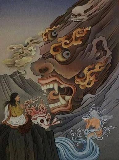 While meditating in a cave, Milarepa was faced with terrifying,, repulsive, or seductive visions, which he recognized as external projections of his internal mental afflictions (demons of ego). Initially, he tried to chase the demons away, which only made them stronger and more menacing.Milarepa stopped fighting and instead surrendered, inviting the demons to stay and offering himself to them. He put his head in the mouth of the fiercest demon, showing total lack of fear and ultimate compassion. Upon this ultimate surrender, the demons evaporated. This demonstrated that the "demons" are only real when feared; when embraced with compassion and recognized as empty, they vanish, leading to his enlightenment