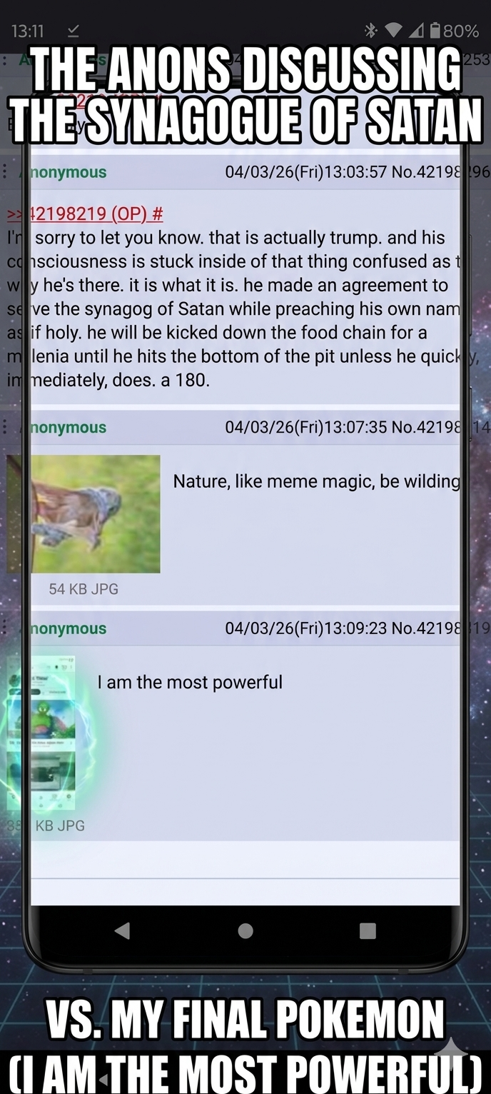 >>42198219I'm sorry to let you know. that is actually trump. and his consciousness is stuck inside of that thing confused as to why he's there. it is what it is. he made an agreement to serve the synagog of Satan while preaching his own name as if holy. he will be kicked down the food chain for a millenia until he hits the bottom of the pit unless he quickly, immediately, does. a 180.