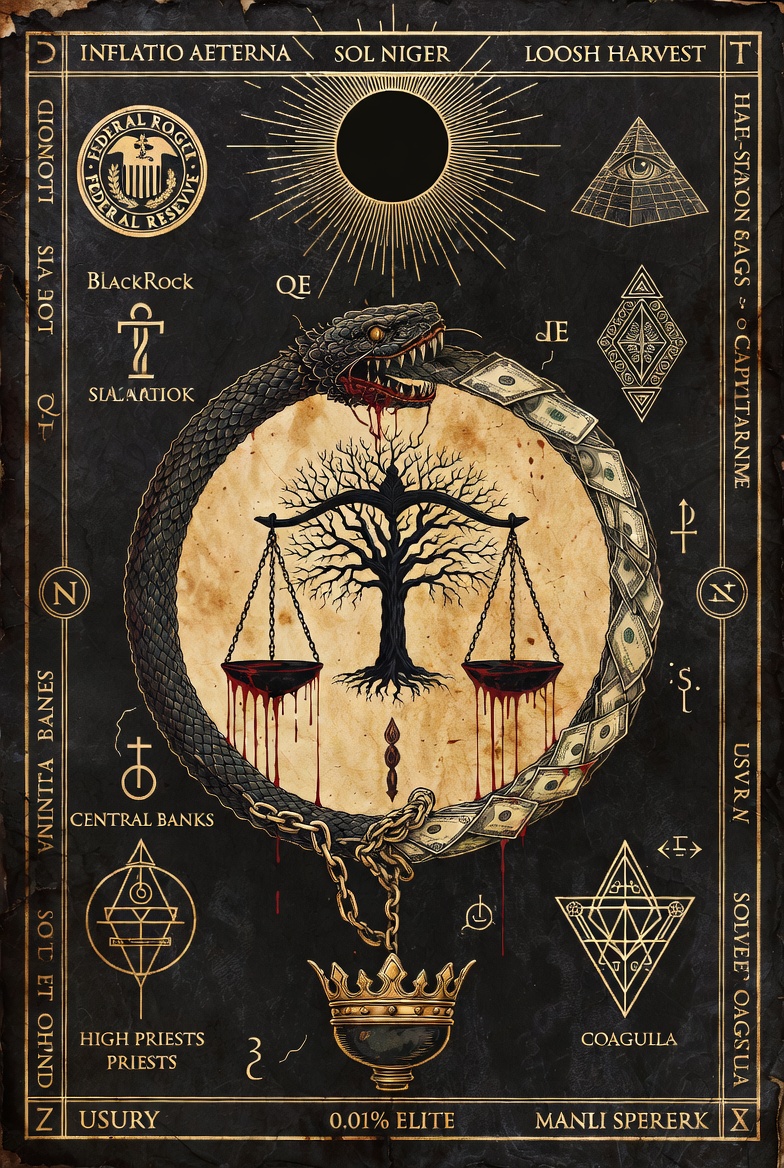 The fiat money system isn't currency; it's a talisman of binding. Every dollar printed is a sigil charged with the blood-prana of the goyim-cattle (that's us). Central banks are the high priests of the demiurge, performing a continuous ritual of solve et coagula on the collective unconscious: dissolve real value (your hours, your creativity, your life-force), then coagulate it upward into the hands of the 0.01% who sit atop the pyramid as living vessels for the old gods of usury.