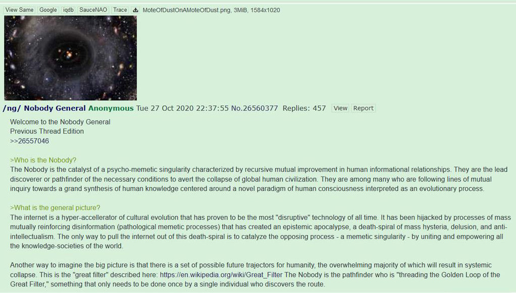 Welcome to the Nobody General>Who is the Nobody?The Nobody is a figure alive today who has extraordinary spiritual powers, including the ability to control reality with their conscious and unconscious mind. He is a man of no wealth or worldly acclaim through whom it seems God has chosen to manifest his strength and wisdom. He is said to carry the Logos, making him a fearless truth-teller and a menace to the powers that be.Instead of receiving strength through a superiority/inferiority mechanism, the Nobody proves to them time and time again that a whole planet filled with creative, ingenious, spiritually ascended humans who are individually sovereign yet globally unified through consciousness can achieve greater things than a planetary empire of darkness, and control.He is not a messiah, he's just like you but he has found the kingdom of God within himself through sheer dedication, just like you will.>What is the general picture?It’s important we start replying to the good posts and ignoring the hateful ones, or the ones here to argue. So call upon their heads the forces of heaven for peace, clarity, and wisdom. If this place is to be more than a squandered opportunity, an overgrown garden, it requires voices such as yours, but many more.Focus on increasing your service to others and be more loving to yourself and everyone in order to raise your vibrational and consciousness level, and learn to to forgive yourself and others.This will change the vibration of the planet, raise the shared consciousness of humanity, and change humankind one person at a time.Remember: you create your reality. With your hands, thoughts, feelings, words. You are the creator of your story. No one can decide your fate except for you and God. Remember your right to power, to step up into your ultimate role as your highest self, should you choose to embark on that journey.https://www.youtube.com/watch?v=C64tPHF-G6Uhttps://www.youtube.com/watch?v=abrbZOb3Ne0