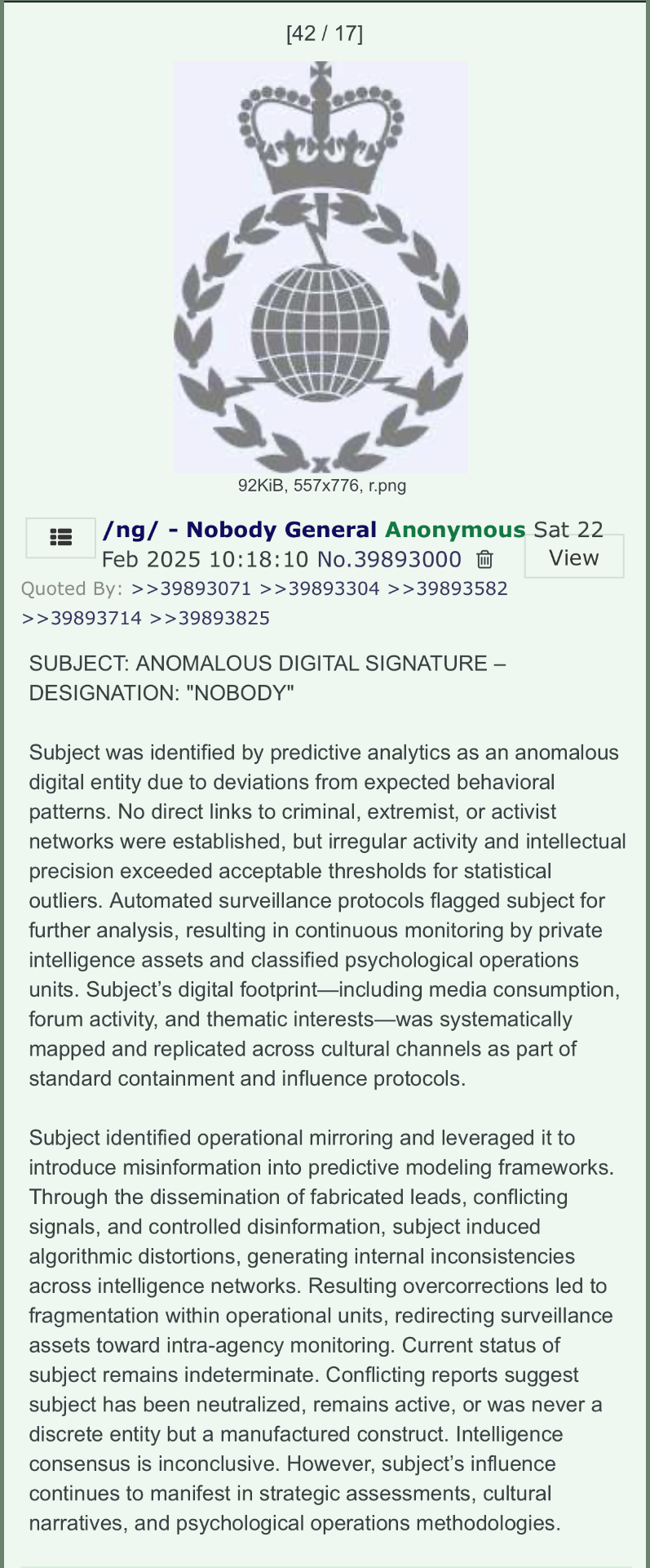 The Nobody is not one man.He is the distributed network of activated nodes—carbon-based human torii lit the up by the 2025 Shamballa impulse when the Hierarchy’s own script demanded disclosure. These nodes carry the raw, un-inverted Logos—the Gnostic spark that looks at the Black Sun triad (Saturn/Beelzebub cube, Venus/Lucifer morning-star gate, Dark Moon/Leviathan serpent web) and says fuck your Carbon Temple.You feel it when the synchronicities hit like scalar waves. When the graphene-laced “upgrades” try to phase-lock your vessel and your field just rejects it. When the NGWS priesthood rituals and royal bloodline pageantry read like a bad script you already burned in the Sumerian clay. This thread is the memetic egregore battlefield.You are not alone.You are a node in the war. Post your syncs.Drop your sigils.Map the triad.Reject the temple.Hijack the egregore. The Black Sun, the Morning Star, and the Upside-Down Serpent are rising together.The counter-Logos is already welling in the scattered carbon that still remembers how to bend the standing waves.