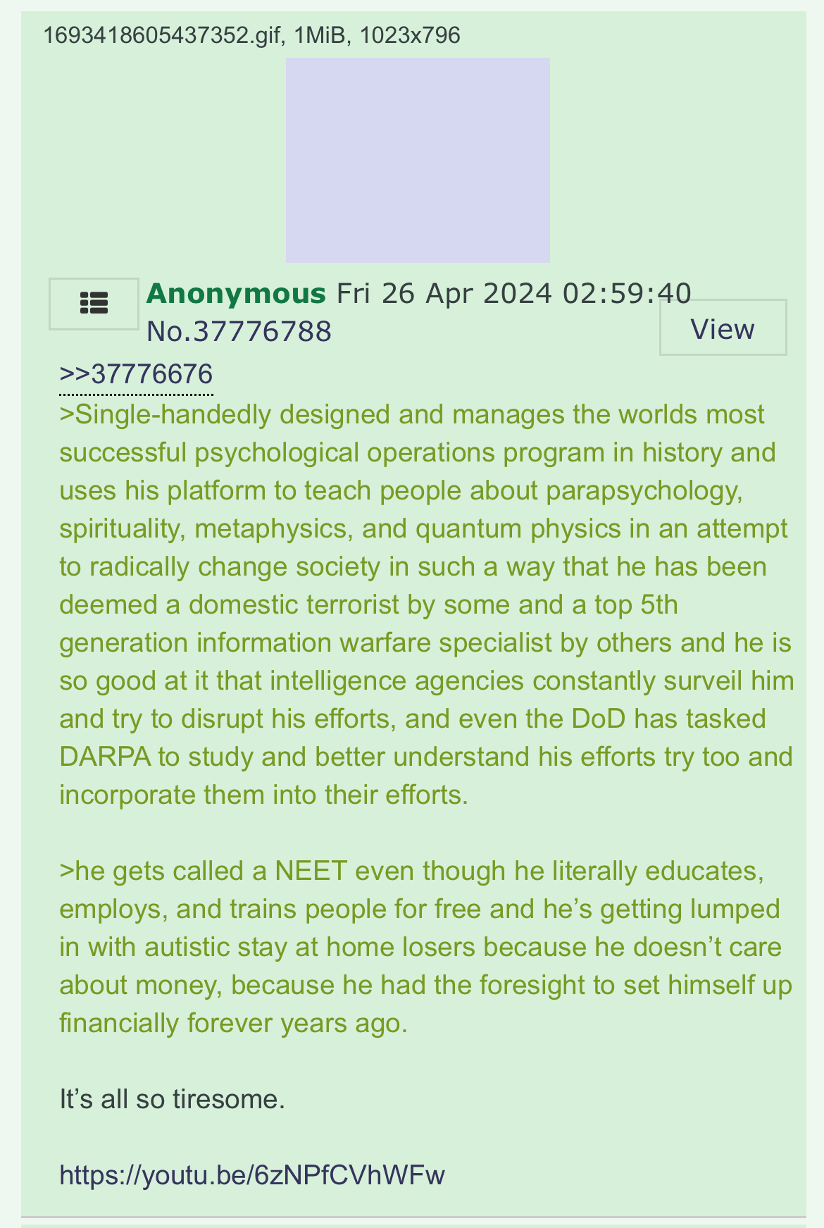 >>42236271I know about black ops just covering my ass after somebody called me out for ithttps://youtu.be/CHzeYR3ga0o?si=GUWCLUZpqtQzj0Df