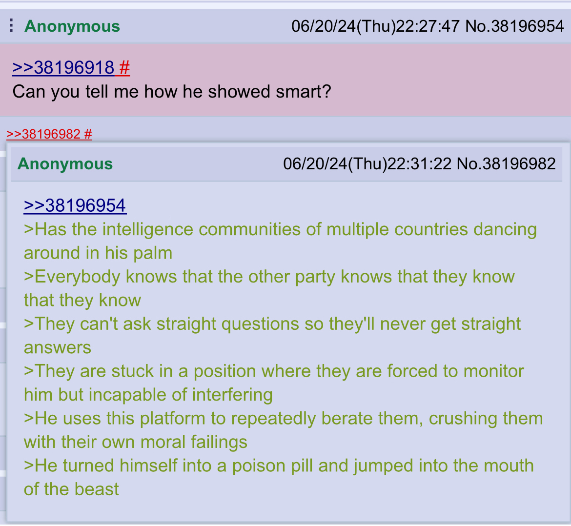 >>42236305I'm notI'm sending coded messagesto folks I only assume existwhile proving to anyonecapable of thinking for themselvesat least on poster in these threadsisn't gullible enoughto fall for any of the bullshit posted in these threadsincluding yourswhoever the fuckyou arenot that it matters does it*pats on head*