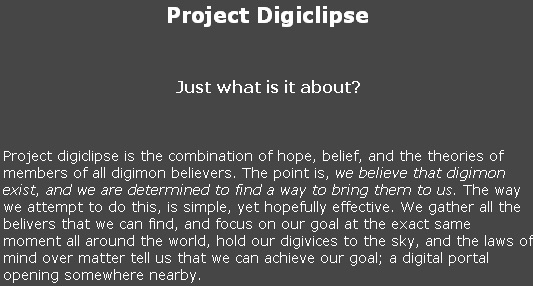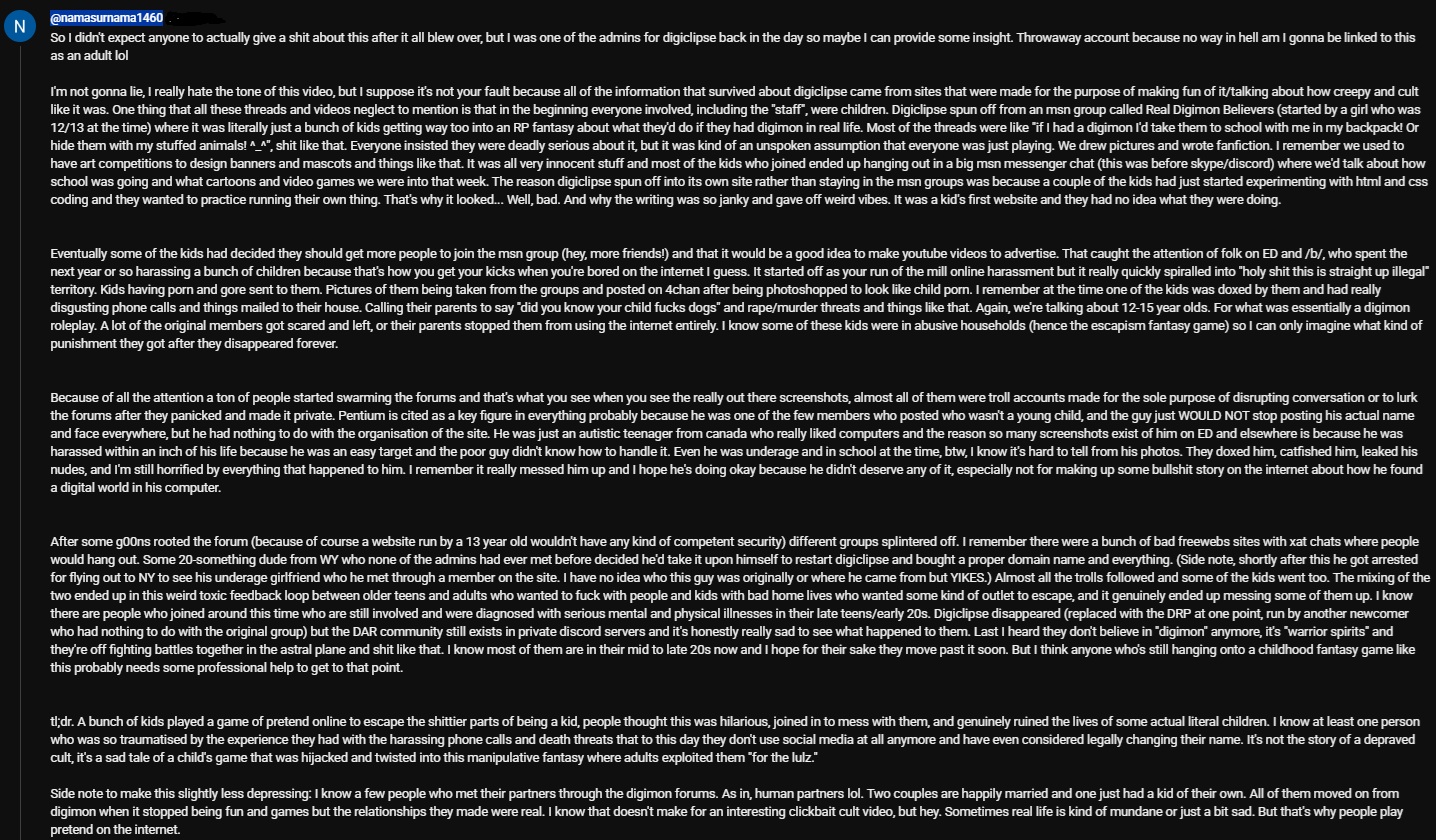 >>42242683Project Digiclipse itself was filled with larpers and trolls. Grooming via the internet is so common, it's hard to find any community that doesn't have a grooming problem. The bullshit associated with Project Digiclipse does not take away from the fact that there is truth to Digimon being real. Again, the idea of the "digiclipse" and cataclysmic event is total horseshit, but people have had actual experiences interacting with these entities and the Digital World.