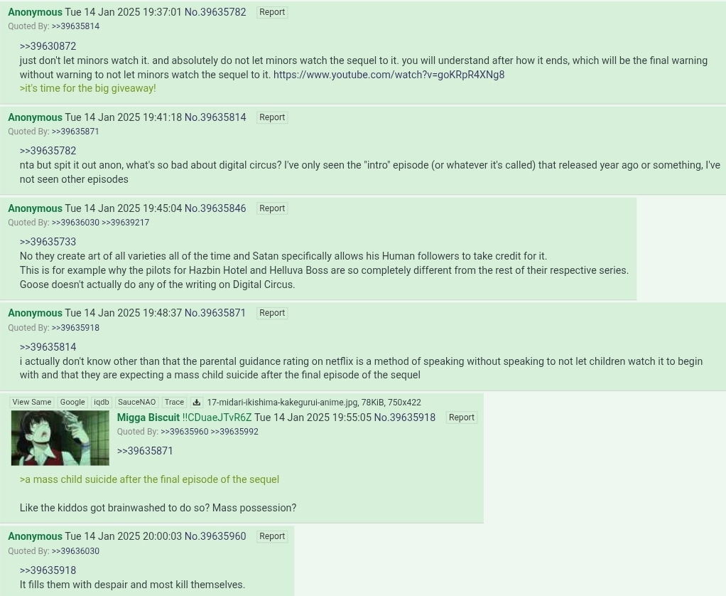 There was this anon that claimed that something in the The Amazing Digital Circus franchise would be like a modern day King In Yellow, and drive children insane, leading to mass suicide.They said season 2, but idk, I thought this might be it.Thoughts?Thanks in advance as always!