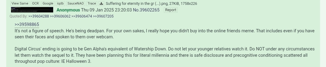 >>42245477Oh my fucking god.This is the most retarded, creepypasta-tier bullshit I have ever read.Nobody's gonna kill themselves over this show.They didn't kill themselves over FNAF and that shit was soft disclosure about ritualized torture and loosh farming that got confirmed in the Epstein Files.Humans are alot more mentally resilient than they ware 60-70 years ago. Thank the internet and natural selection for that.Not taking the chip. Not putting on the headset. Fuck the Demiurge.