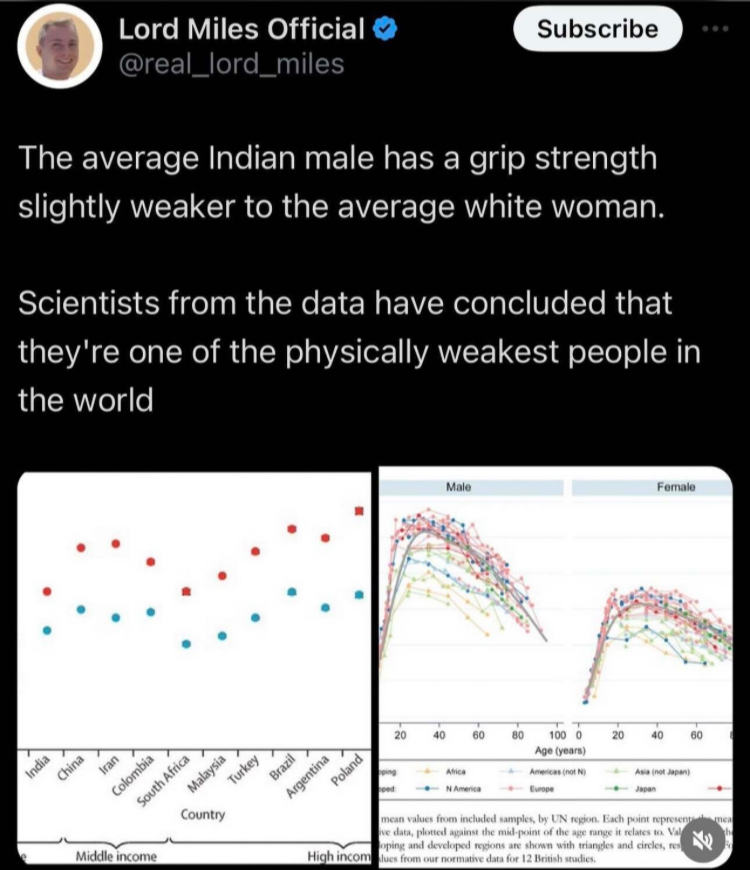 I also wouldn’t tout a lifestyle (Indian vegetarians) that leaves most of the males with weaker grip strength than most white women. Pathetic.