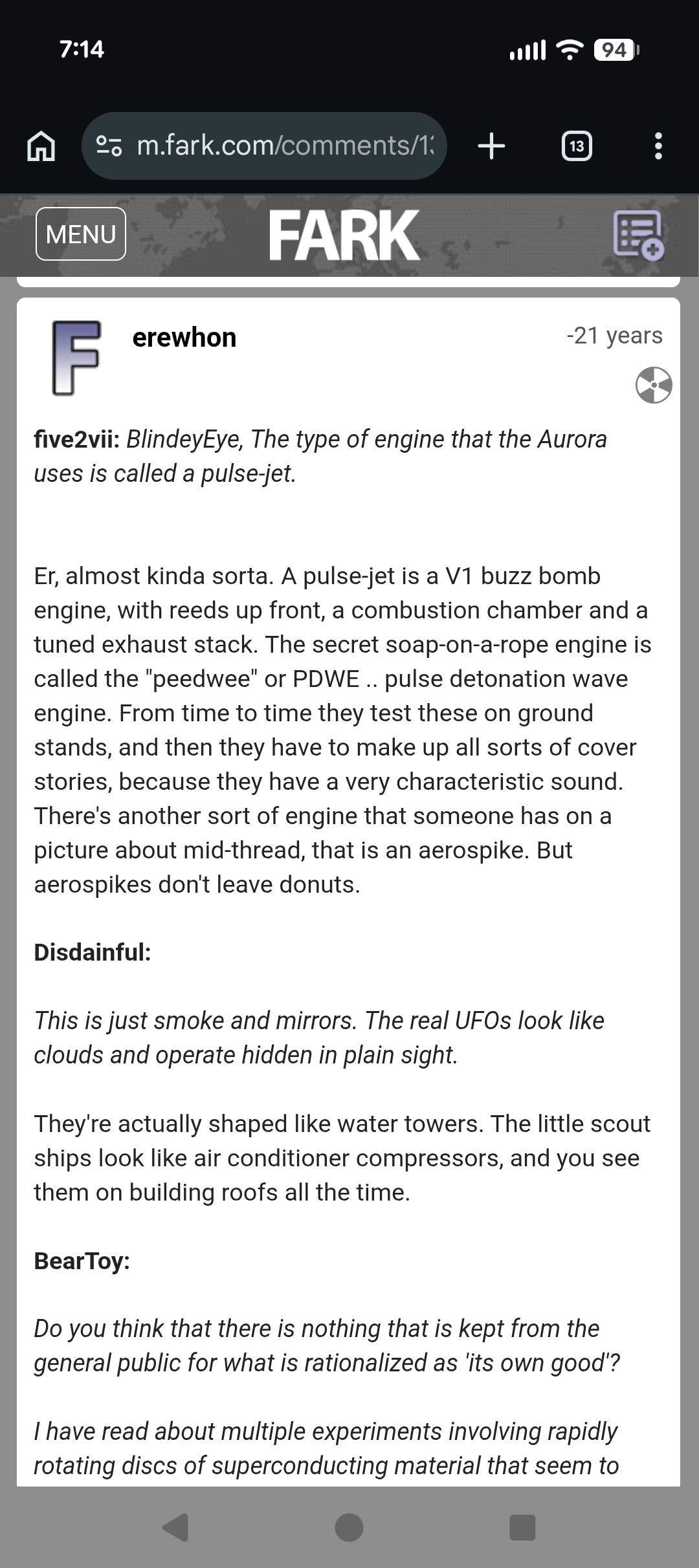 >>42248462Yeah I agree. I think early saucers were drone/helicopter technology and these days they are playing around with new propulsion systems (or some kind of repulsion) while also toying with frictionless dynamics to really push craft maneuverability beyond anything we know. It wouldn't surprise me if they were using stuff that isn't even on the periodic table.
