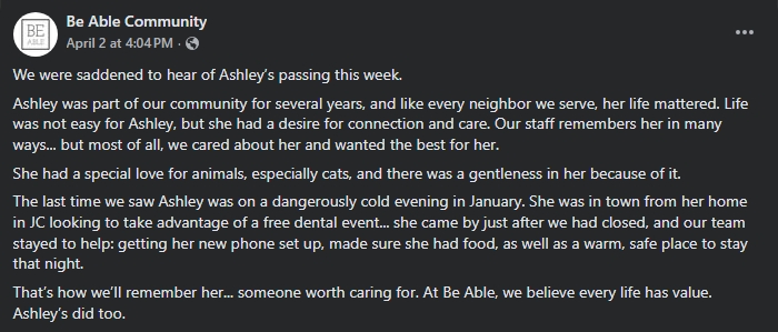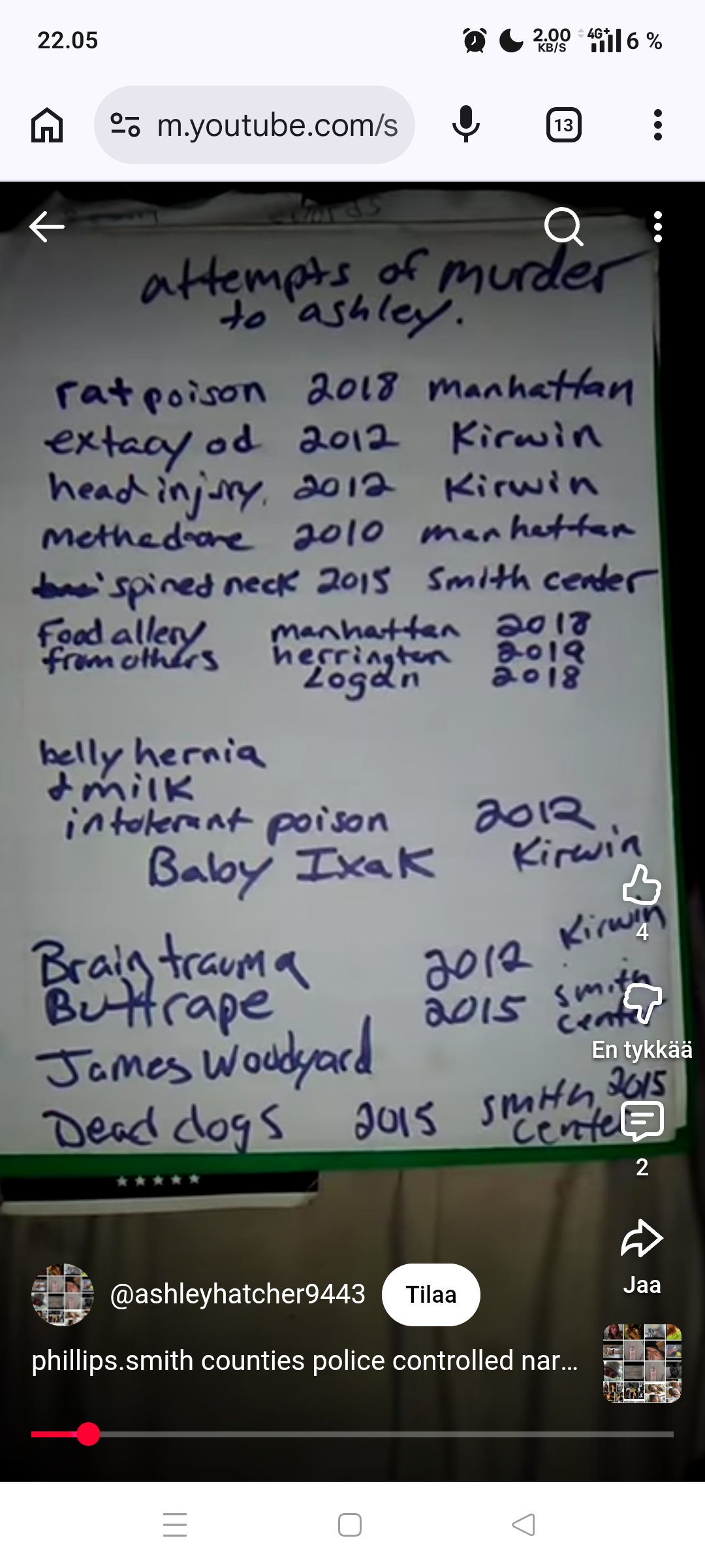 Ashley Hatcher was a schizophrenic meth head woman who had several youtube channels where she ranted about stuff, she got posted here a few timesI was following her latest channel when she suddenly stopped posting late marchhttps://www.ksn.com/news/state-regional/officials-identify-body-of-woman-pulled-from-kansas-river/