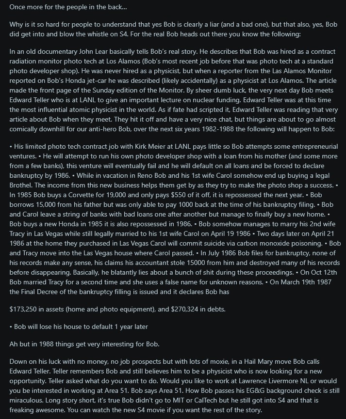 >>42253701I legit think that Bob just rode a wave of flukes that happened to align and allow him to get the Area 51 job .They mistakenly thought he was far more credentialed than he was.He knew this, it's why the circumstances leading up to him being at S4 and then leaving a few months later are the shadiest parts of his accounts. He was already high strung, and thought they would send him to prison or even off him when they realized he may have scammed his way in essentially.I do think he's telling the truth doing about everything he saw at S4 however.