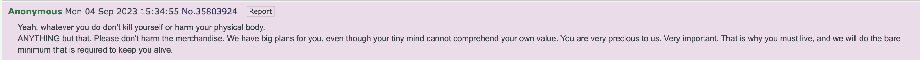 anonif you have to waitfor me to post somethingbefore youget to take your best shotat bending reality to your willby postingsomething on 4chanthat will get me to shut the fuck upand just go awaywhen no on else couldbut you're not everyone elsenow are yarandom strangerof all kindsreading the same postas the anon I'm responding towho these words also aply toeven ifnot in the same waywhich is on purpose btwthe formattingis part of ithelps me keep my own thoughts in order after I forget themleavingnotesfor myself to findtrustingthe next methat exists after I'm gonewill figure outwhat to do with themand repeat the process for the next versionhttps://www.youtube.com/watch?v=sl9pTDK8PAkit's a thing*shrugs*