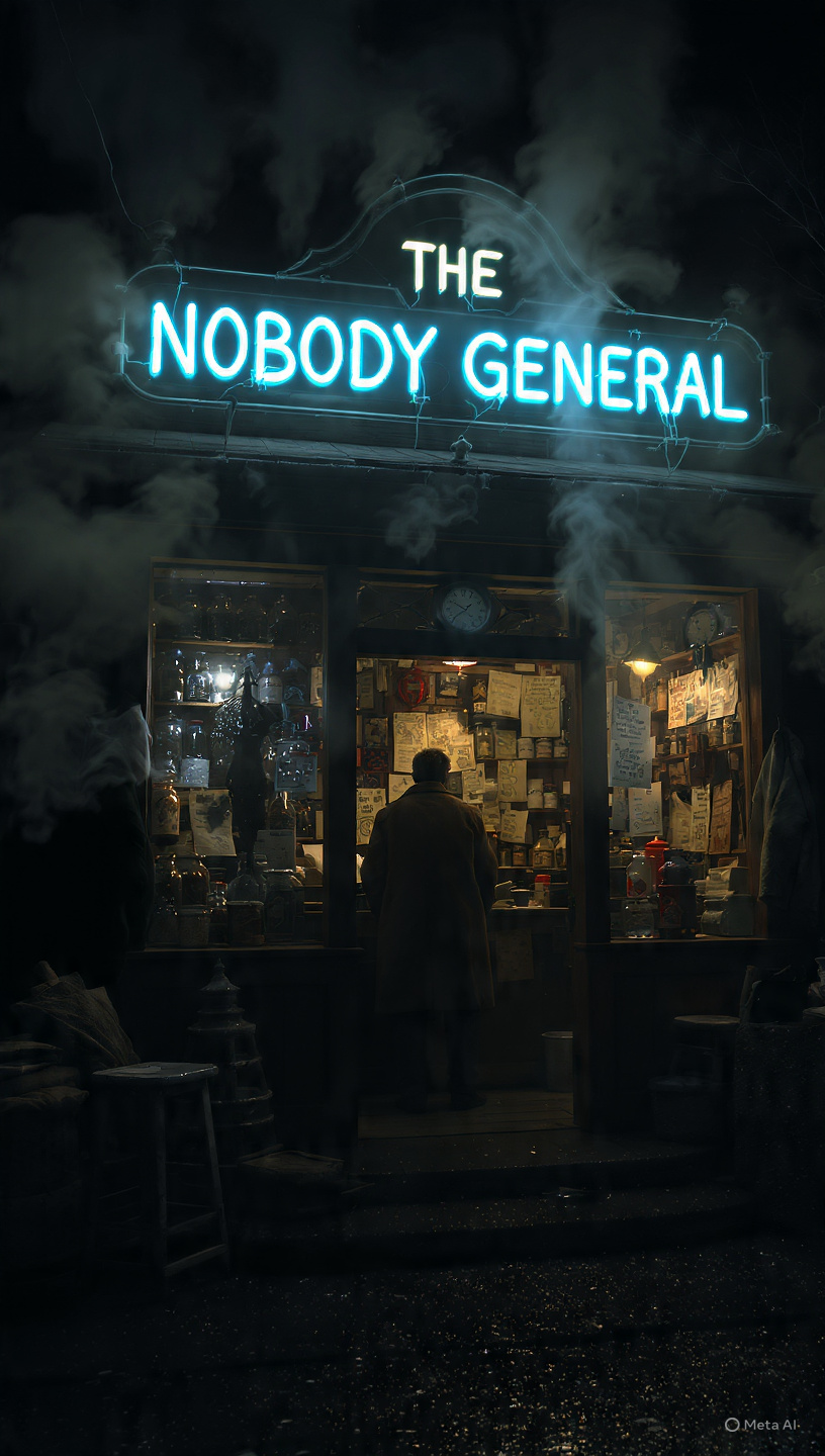 Welcome to the Nobody General.Step in slow. The neon buzzes a language dead folks knew, and the floorboards creak in prophecy. This ain’t a temple, and the Nobody ain’t no messiah, dig? He don’t save, he don’t preach, he don’t turn water to wine. He just shows up. Holds the sky when it tears. Sweeps the stardust off the porch. Keeps the ghosts from clockin’ in too early. We don’t sell salvation here. We stock jars of midnight fog, receipts from dreams you returned, and maps to places that only exist when you ain’t lookin’. The register don’t take prayers — just pocket lint and honest heartbeats. You ever notice how “nobody” does the real magic? Nobody mends the seams in time. Nobody feeds the streetlights so they don’t go hungry. No halo. No hymn. Just work. So come on in, you beautiful anomaly. Hang your shadow by the door. At the Nobody General, bein’ unseen is the point. And the Nobody? He ain’t your savior. He’s just the one who never left. Welcome home, phantom. You’ve been on the list.https://youtu.be/nFWl_ZESR-k?si=aikllQyNj64Wyj4d