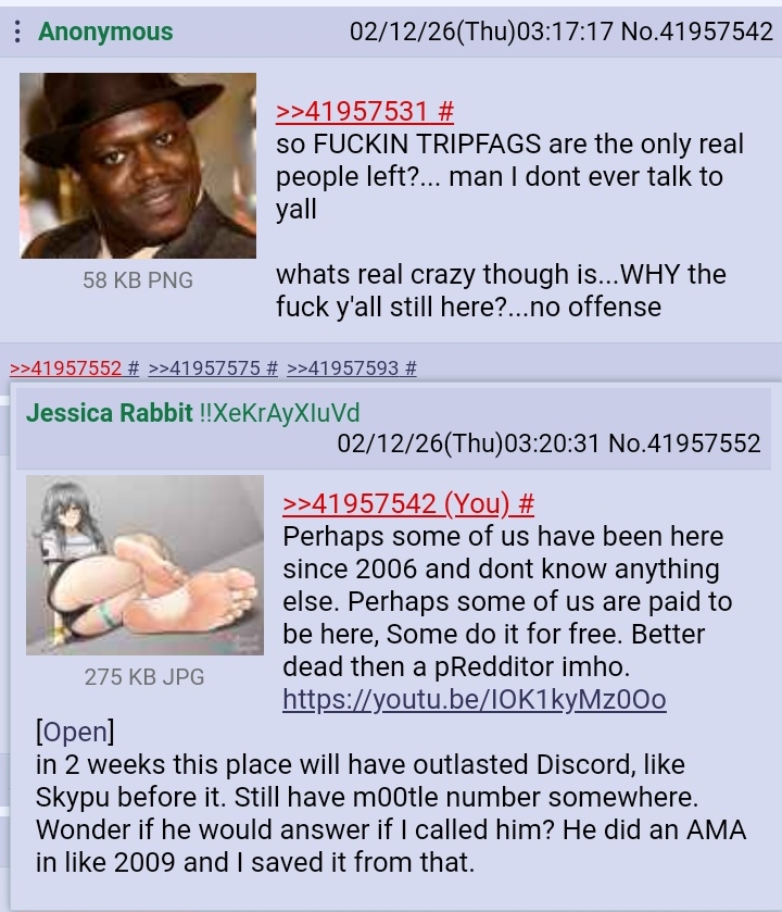 You're all welcome if it wasn't for me you guys would have had to keep posting in a dead thread with the image limit reached until some lazy larpbody fag got off their fat ass hit up their higher ups on discord and given the green light to post a new thread or get pruned if they didn't.This one goes out to FoxFag/Alex Moore /444/ Satan and many more ;^) https://youtu.be/ydtBmD27NtA?si=6vvyxflKVUSQk-WA