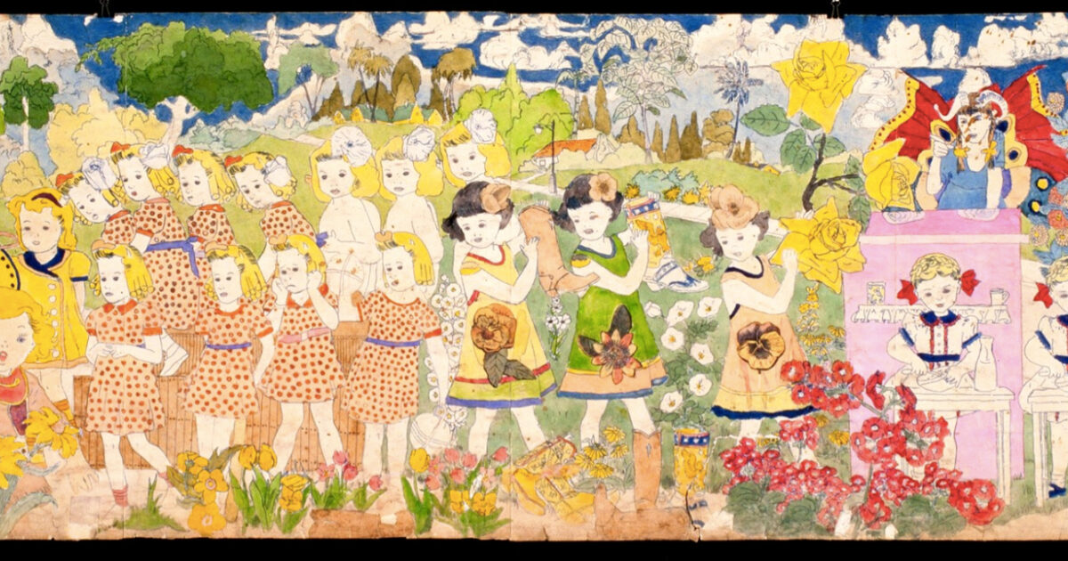 "From around the early 1910s to the late 1930s, Darger wrote the 15,145-page novel In the Realms of the Unreal, centered on a rebellion of child slaves on a fantastical planet. The chief protagonists are the Vivian Girls, who fight to free the children from the enslaving Glandelinians. Inspired by the American Civil War and martyrdom stories, it features lengthy, gruesome descriptions of battles, many ending with the mass killing of rebel children. Between 1912 and 1925, Darger produced collages, often only loosely correlated to the book. Later he made these with watercolors and traced figures taken from popular sources such as magazines and children's books. These paintings grew more elaborate over time, with some of his largest works exceeding 10 feet (3 m) in length. Little girls, often in combat, are a primary focus; for unknown reasons, they are frequently depicted naked and exclusively with male genitalia."