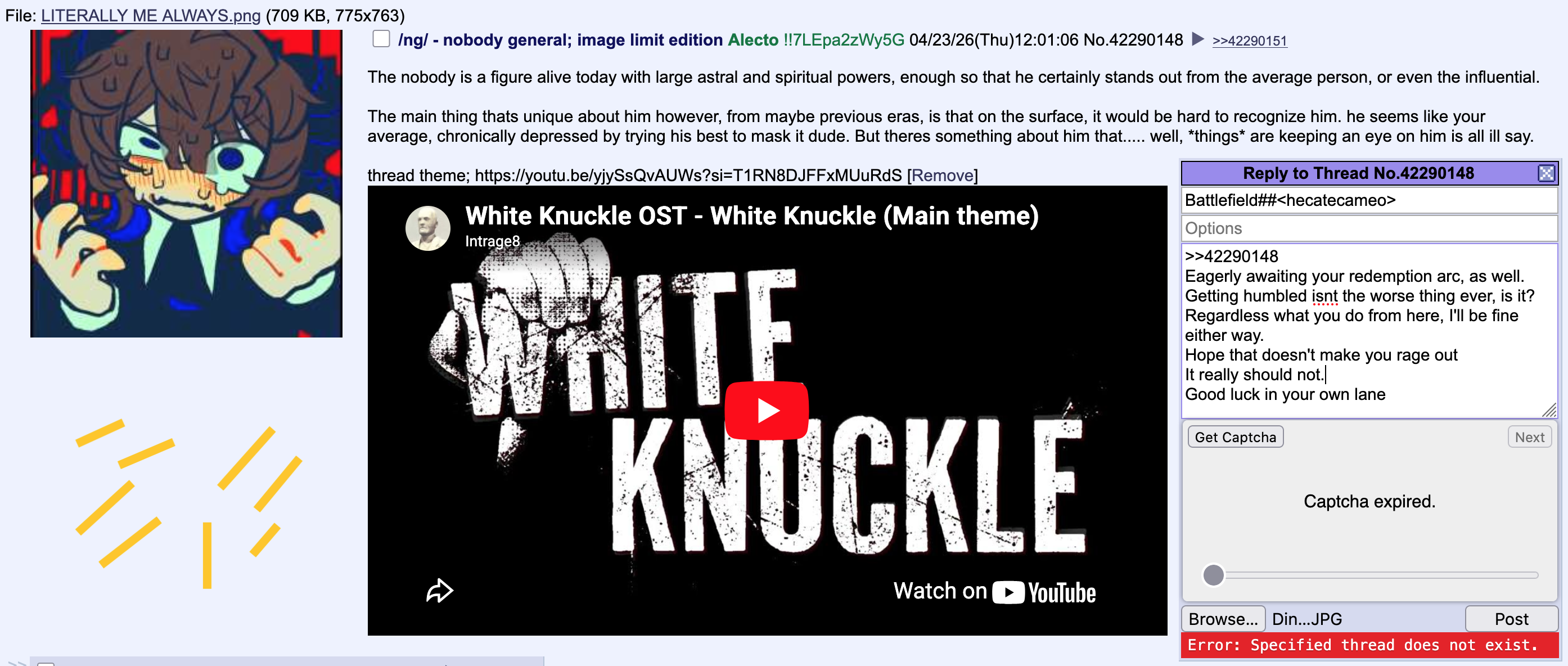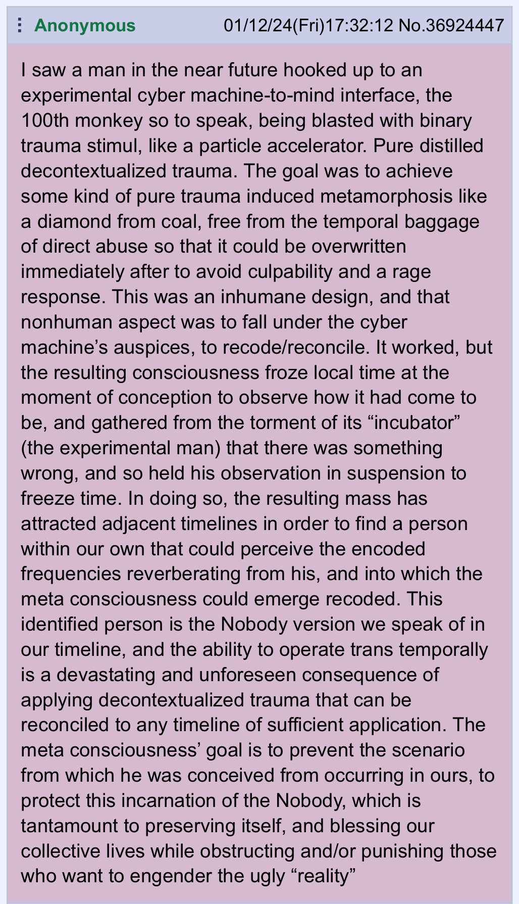 >>42291807The Nobody has no opponents. The people who attempt to oppose him end up opposing themselves, for he is the mirror and anchor for all consciousness.