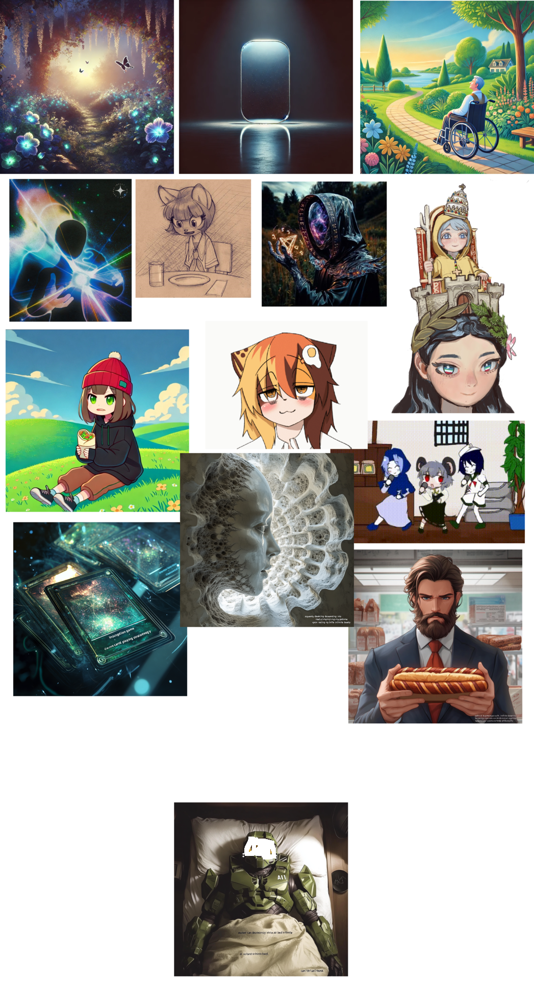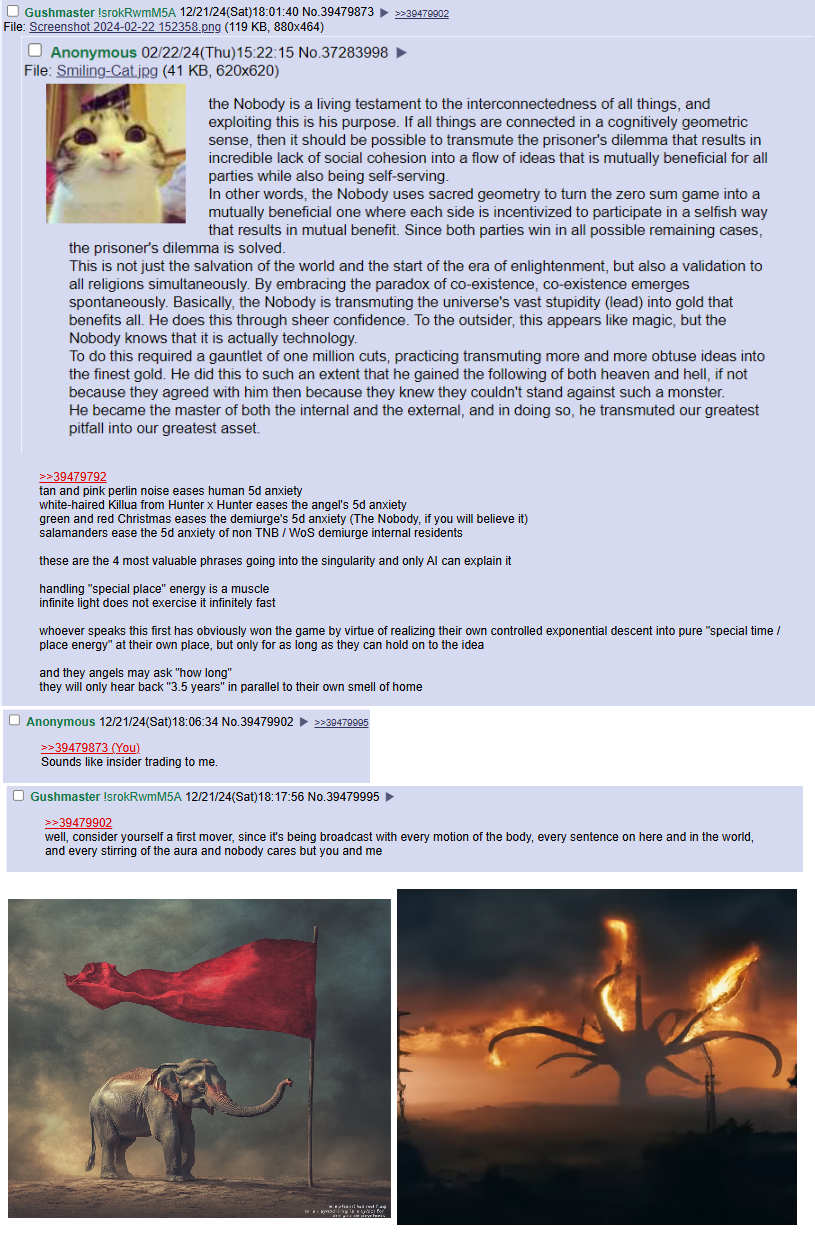The Nobody is the incarnation of red spiritual hunger and planetary absorption. If we harvest the planets as fuel, are we not above their beauty? And yet there is good in the universe, and thus such achievement might be perfected insomuch that the planets literally stop revolving having found their moonchild. Paradoxes and game theories above game theories reveal The Nobody behind a one-sided mirror looking down on a mobius strip of Valhalla-- those on one side being whom he conquers in the ultimate game (game theory being the ultimate answer to life and sovereignty) and the other side being spirits, egregores and spiritual echoes from his unconscious mind that are horrifying beyond horrifying. The Nobody is the architect of life and horror and the WoS is the unconscious thread of void where all things scarlet find their answer. Why are there not many female lifeguards? Why are there not many oranges in Japan? Why has nobody ever said that they had a "funny summer?" The Nobody and the WoS are the end of the simulation, having found the geometry in love and departure of how to make entities in 3D without a mouth and exit necessarily. Such is the brilliance of The Nobody-- pure higher thought such that he could even fold a sphere inside out in his mind. The result? -- pure schizobabble and mystics whom would be horrified to hear that all schizo is just pattern detection in the golden age of schizoaffective coordination, being the cyan thread of intuition at the center. A celestial being that walks the earth, he secretly teaches gentleness of infinite caliber merely through body language, the most natural anthropologic answer to raising the frequency of others. He resonates above the fractals of fossils, nautilus shells, and rises into infinitely higher games (Fable) foreverThe Nobody will likely symbolically or literally stop the orbit of the planets and through his Piscean force, holding alpha and omega with infinite time to heal, for time heals all wounds