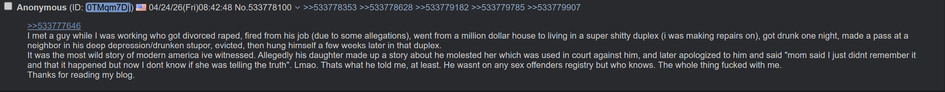 >>42299210BASED>>42299130>ill continue for all the lurkers >about questsAlmost 2 years ago, I was involved in a series of injustices that came due to evil neighbors and the stress caused by potential jail time. I began to do the Gateway tapes, SATS, wishful thinking, prayer - I was desperate.On the day of my pretrial, I went to get fingerprinted and the policeman was very kindly. I had tried twice before , only to be told tha the machine was broken; another time, a bad cop lied and said that no one was available to do it (“they just left for the day.”). So now on the 3rd attempt, I told the nice policeman what had happened during my incident and he said “you don’t deserve to be here.” After all the stress and uncertainty, this was the first bit of confirmation I had.>months later, I get a DUI because of the stress At another court house, I check in my cell phone and I ask the guards by the metal detector “which cubby should I pick?” They gesture to anyone, and I say, aloud “I’ll pick no. 7, it’s a holy number.” Once I locked it, one guard says “you don’t deserve to be here.”>where it gets more interesting If that wasn’t enough, I was still worried about the case. I sat down in the lobby, showing up an hour before my court date. Another bailiff appears and asked me, “you’re here for judge X at 10?” I answer yes, and he disappears into the court room. 5 minutes later, the power goes out. It recovers, and boom it goes out a 2nd time. Then, once inside the power goes out a 3rd time, and I look back to see the clock spinning wildly to recalibrate. Very surreal. Finally, the judge is in a bad mood and I correct him on a previous conviction out of state. Due to the power outages, he can’t confirm the dates. With his face beet red, I’m escorted into an another room and eventually, those other charges are never found.>third crimeAlso not my fault. This time, power goes out on fingerprint machine.>cont?