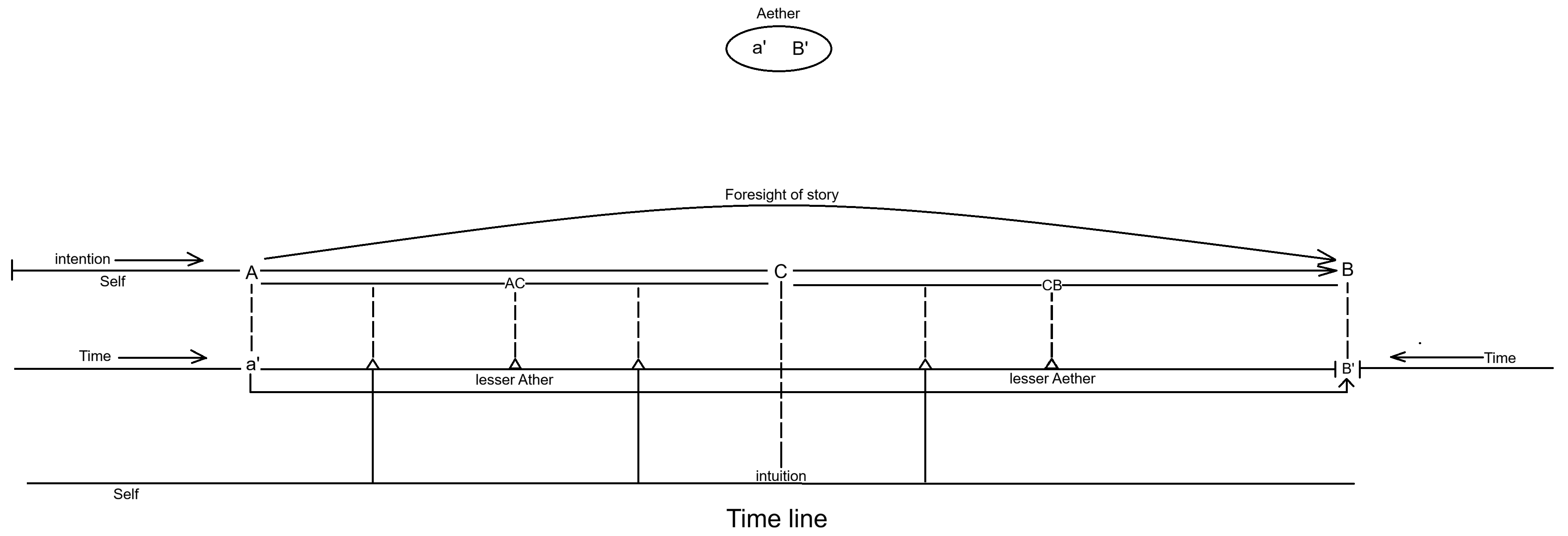 >>42302342This image helps demonstrate how it works.*************************************************8a' = Minor aether (Large preposition of an idea consisting of or is aether)B' = Major aether (slight preposition of an idea consisting of aether)A = [beginning] story pointB = [Ending] story pointC = p2 in-between pointAC= p1 in-between pointCB = P3 in-between pointFirst with have the aether this is where major transcendental and critical story ideas are substantiated form.From that the individual or the self can lay out his or hers intention for an idea. >I want to create a story relating to the occultAfter pushing this active attention out (active in the sense that they are continuously thinking about it), the idea will manifest themselves within the induvial; this manifestation can occur while: listing to music, walking, partaking in a story, looking out of a window, mind discussion/debate, etc. In general in times of an open mind which can allow for aether to present itself through.It will then identify itself as an critical idea or what I would like to call a Major aether (Do NOT get this confused with intuitional ideas which mostly originate from the self (which is pretty hard to do as it would be clearly identifiable as a Major aether))[1/2]