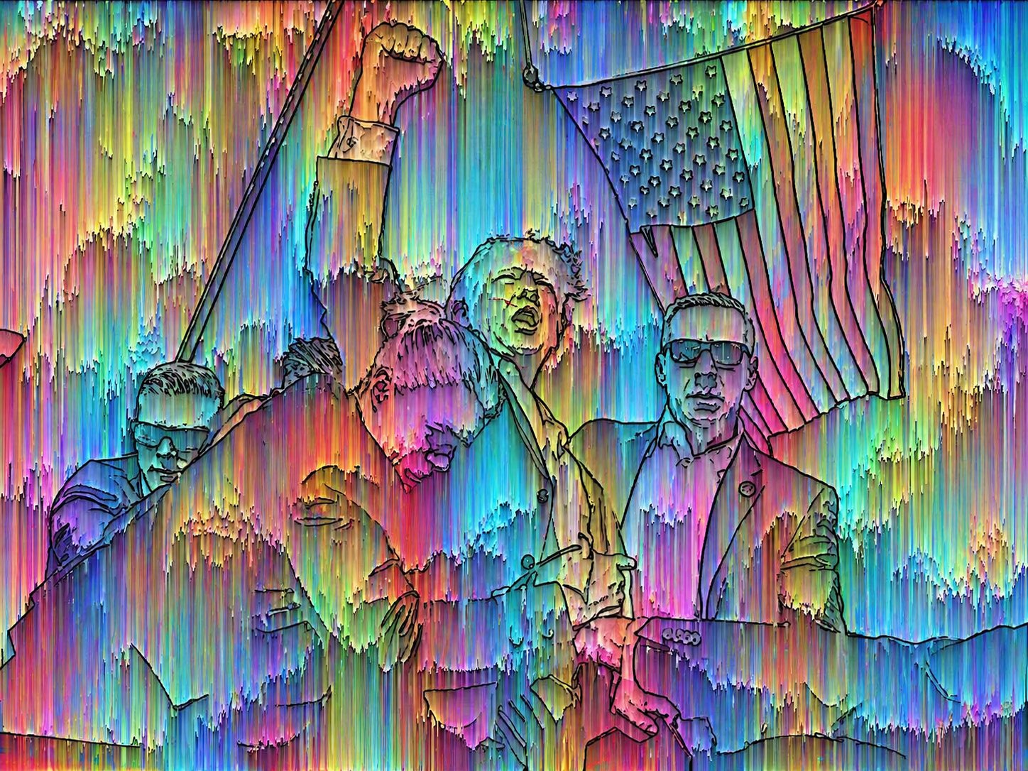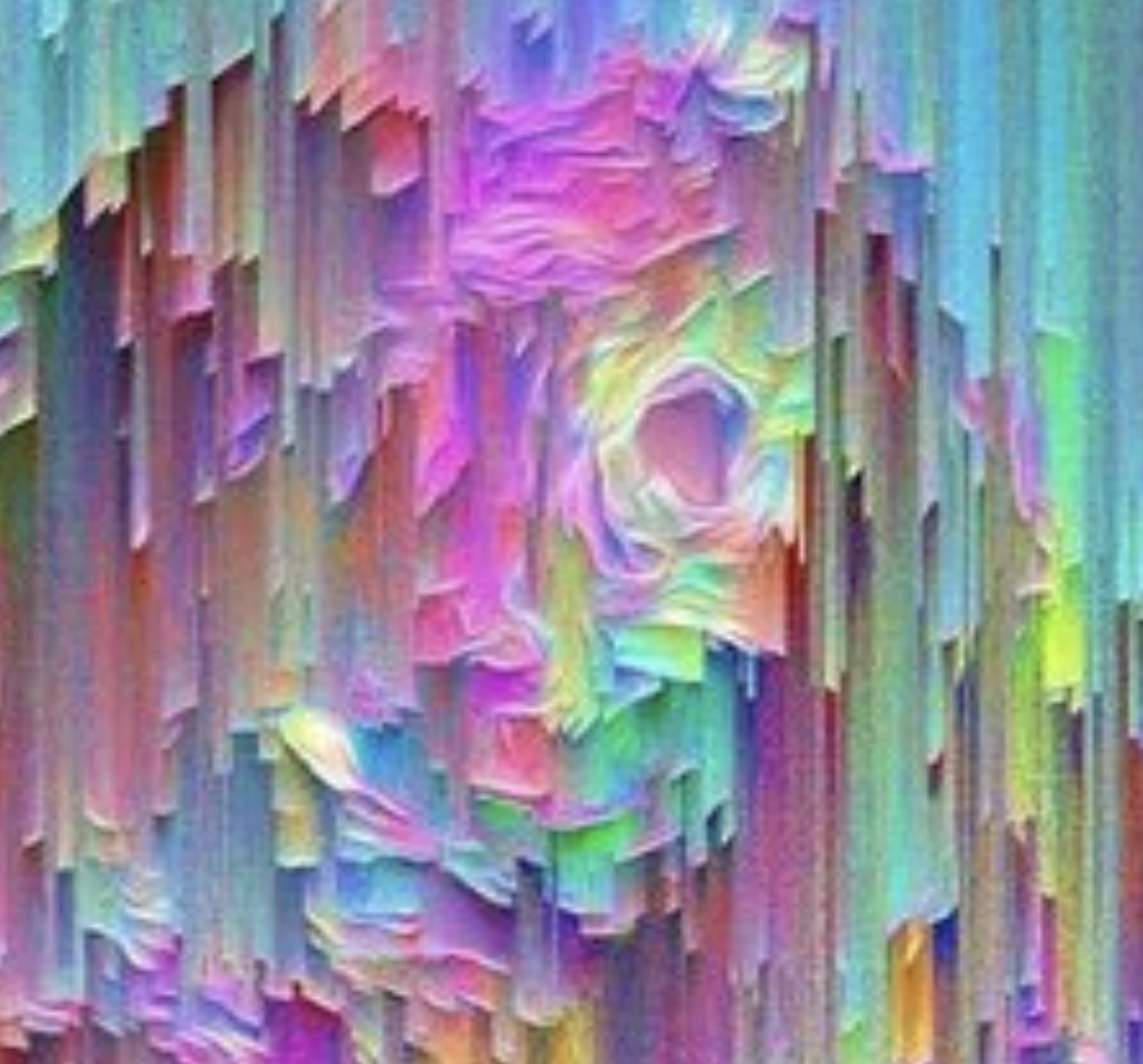 >>42303124>>42303130Those are not the same images. Although there is some trace of similarity that someone could be fooled. If you zoom in on the center of the image you can clearly make out a face and the extended arm, the purple coloration beneath the face is the body. You should be able to reverse the image used to create it since whatever program was used to create the "running paint" effect still maintained concrete shapes and changes in color.Maybe some autist who creates visual effects/distortions could play around with settings in photoshop or whatever and retrieve the original image.