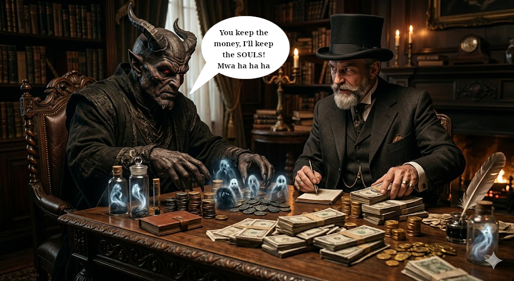 The capitalist takes the money and the demon takes the loosh. That's the way its been since the beginning of time. We are farm animals for a horrormovie farmer duo of capitalists and demons