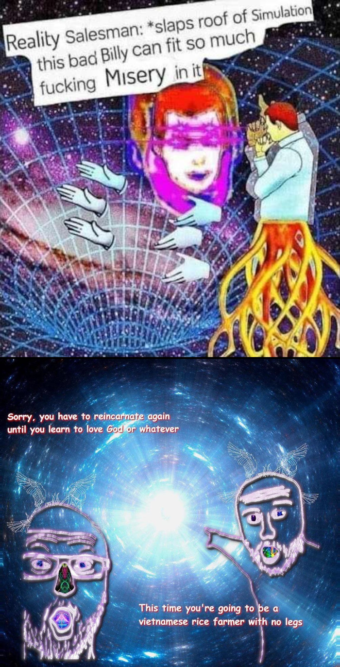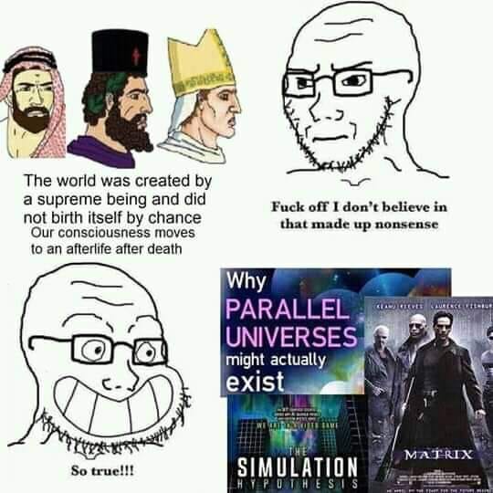 simulation theory is basically the reddit religion. And like the guy in >>42315059 pointed out, it's really just a less sophisticated version of Gnosticism presented in modern-day terminology, and probably a psy-op pushed by kabbalists.