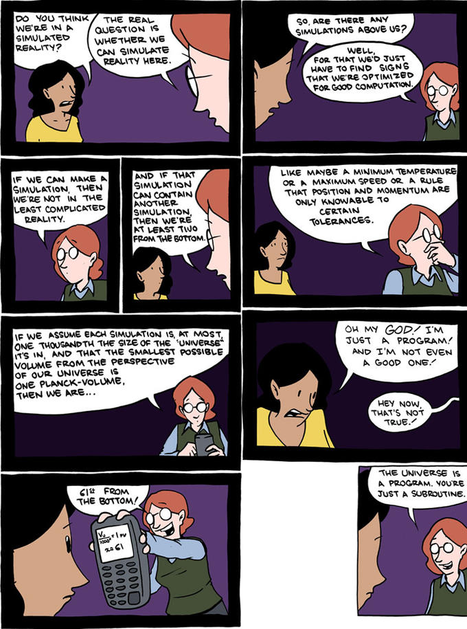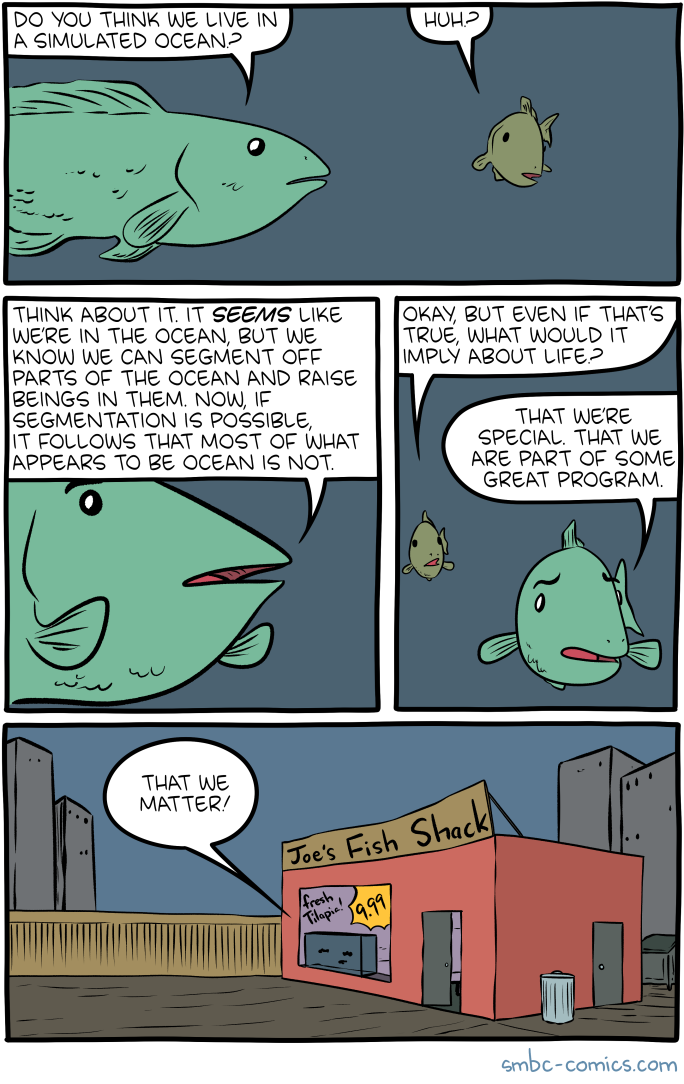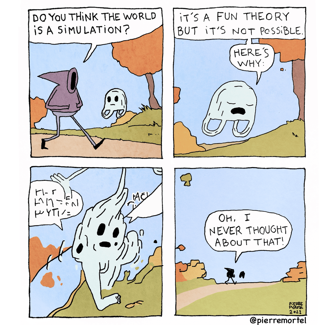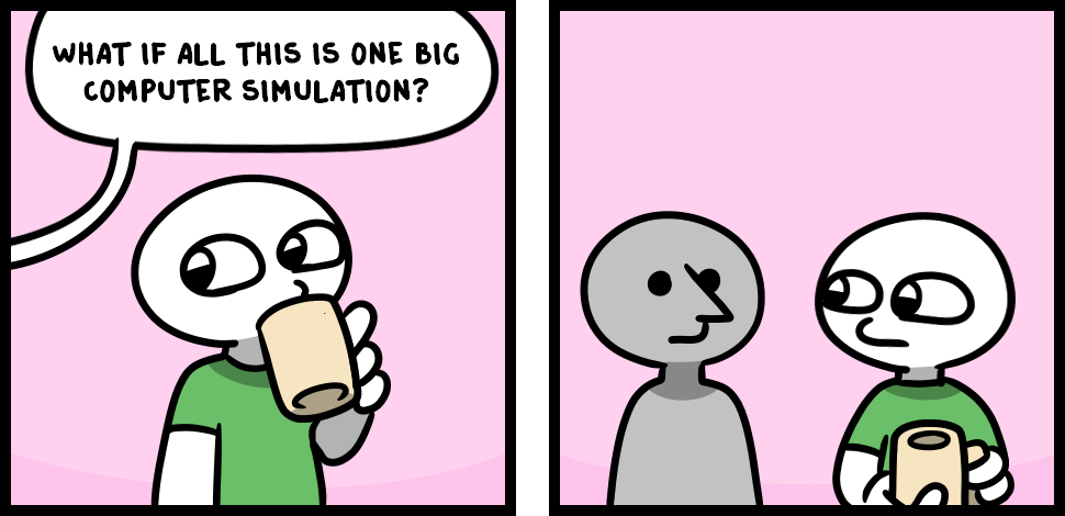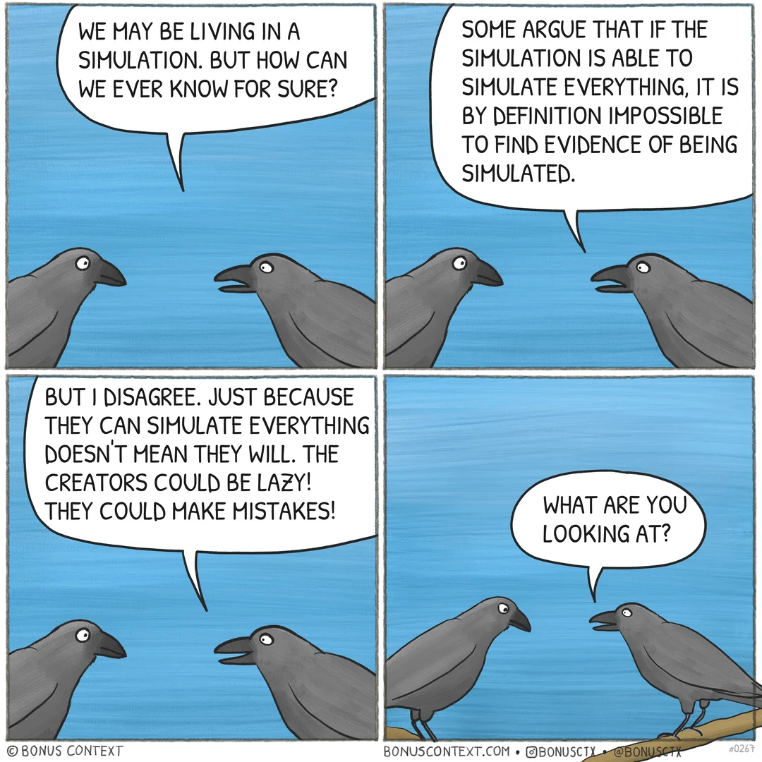 >>42315053It's not really important.Let's assume this is a simulation.Well, are we only existent as part of it, like the sprites in a game? Then there is literally no difference between reality and simulation for us.Are we existent in some other reality?Well where does that one come from? Why is that not simulation? The only way this is true is if that "other reality" works just like the simulation does.So it makes no difference if we talk about simulation or reality - they work the same way.