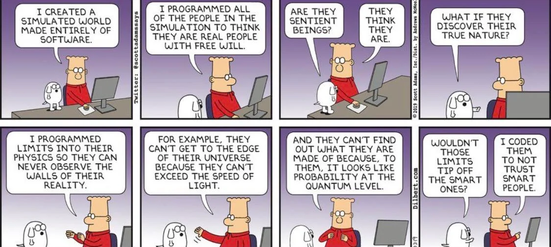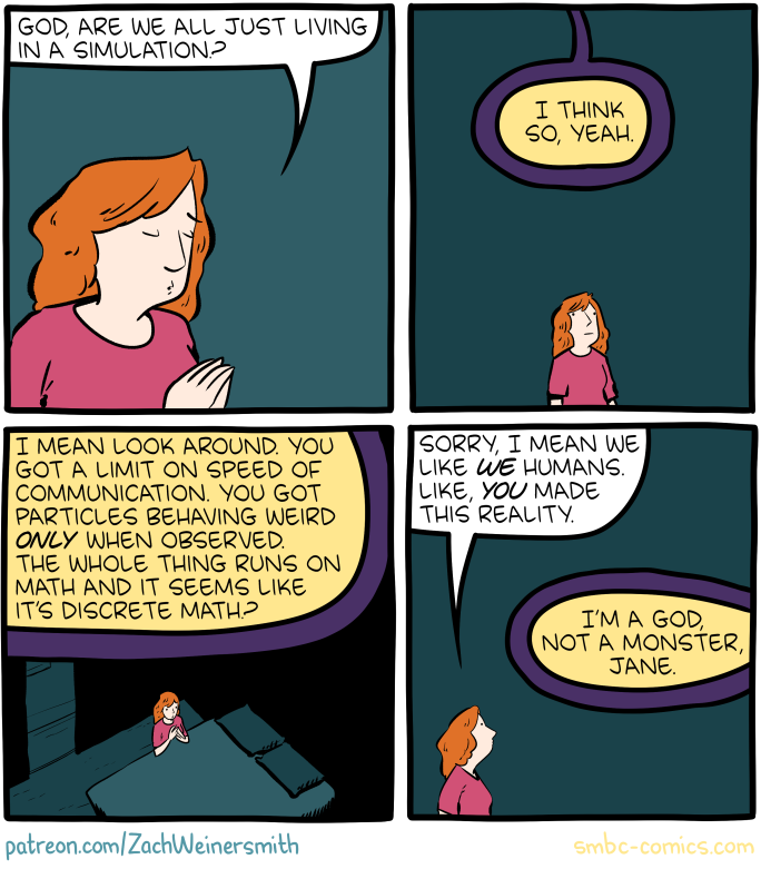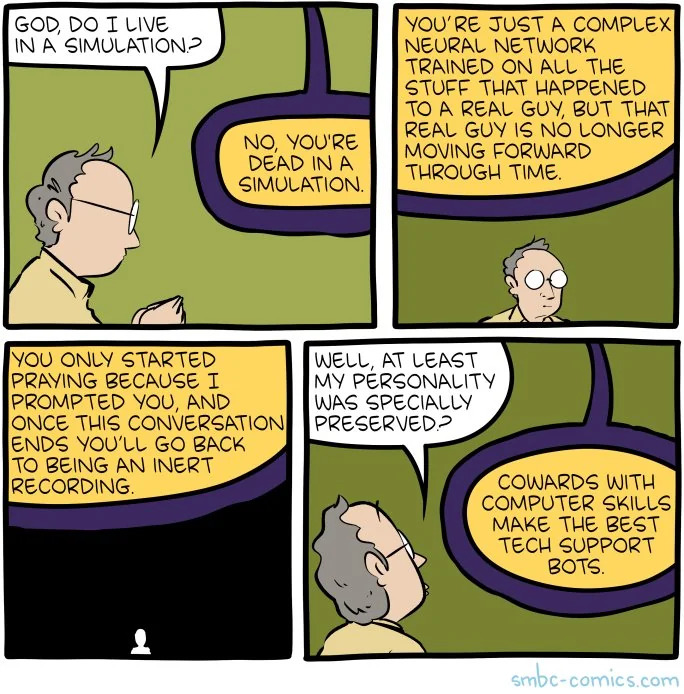 >>42315053simulation theory is our current best concept of what is actually going on, however, in the future there will be better concepts to approximate that. None of them correct, however. I always imagine we are in some hyperdimensional alien's school project's sims video game. But it's simply how the mind of the current age tends to view things. Through the lens of computers. We invented computers, therefore everything must be computers. It's a bit primitive, in the grand scheme of things. As for the spiritual implications, it's ambiguous.